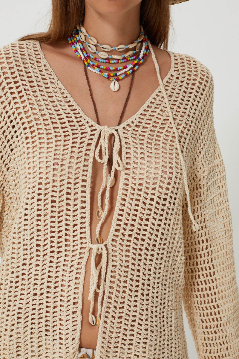 Its loose fit and front ties make it both casual and delicate, perfect for summer layering. Wear over a swimming costume or tank top on sunny days, or in the evening for a uniquely romantic look.