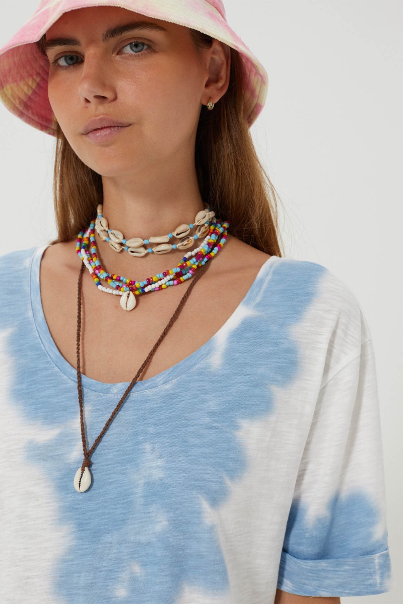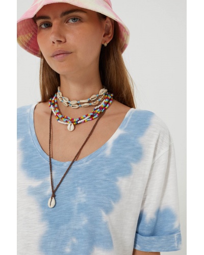 Available in yellow, blue or pink pearls, it can be adapted to suit your mood and your desires. Perfect for layering with other necklaces for a vibrant, happy summer look.