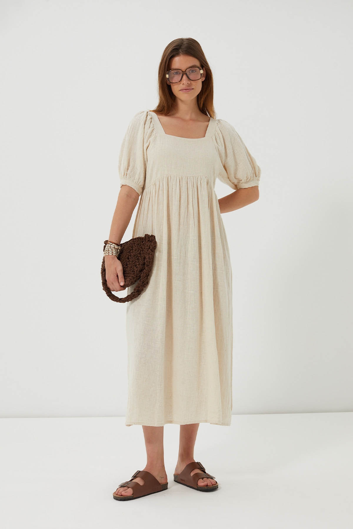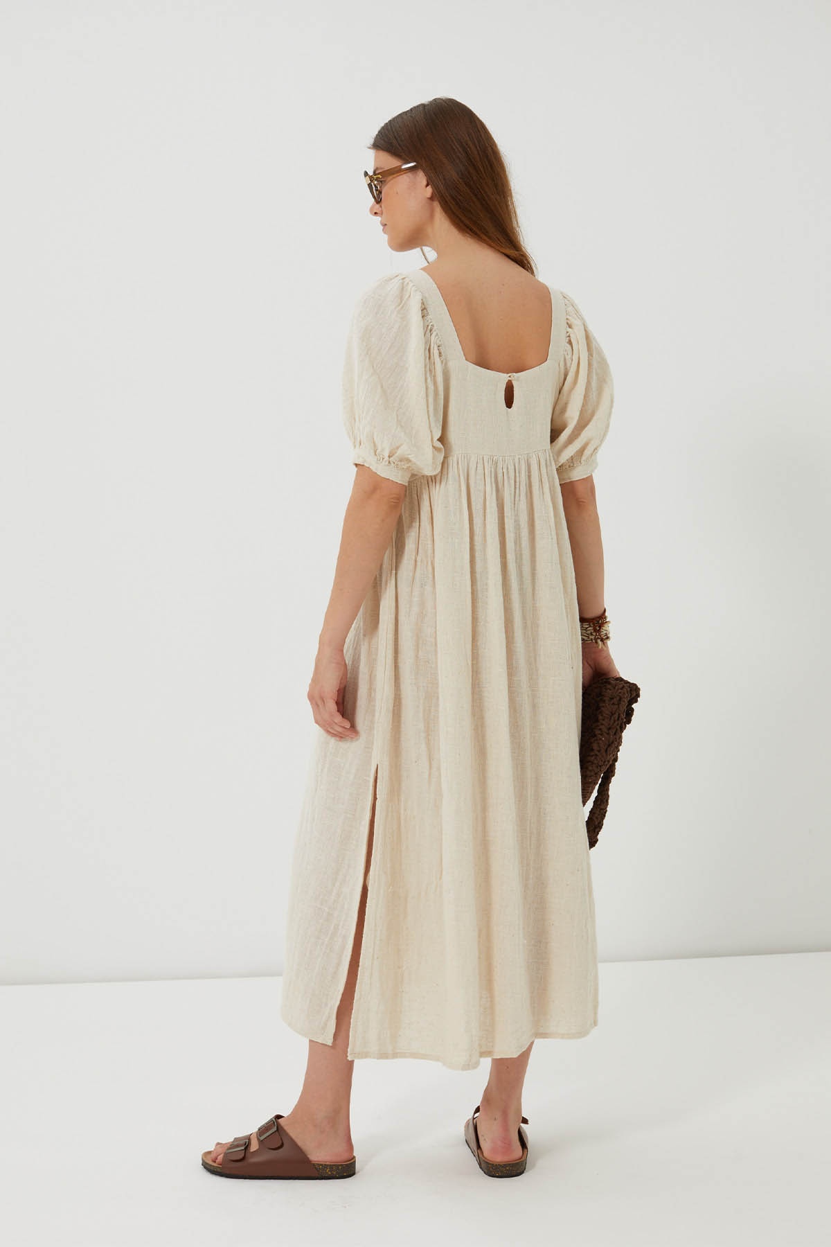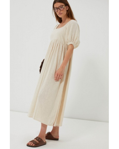 With its romantic allure and flowing cut, the Antalya dress embodies the softness of summer days. Made from cotton and linen with a natural feel, its square neckline, puffed sleeves and ample volume evoke a relaxed, sunny femininity.