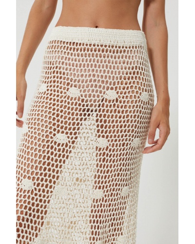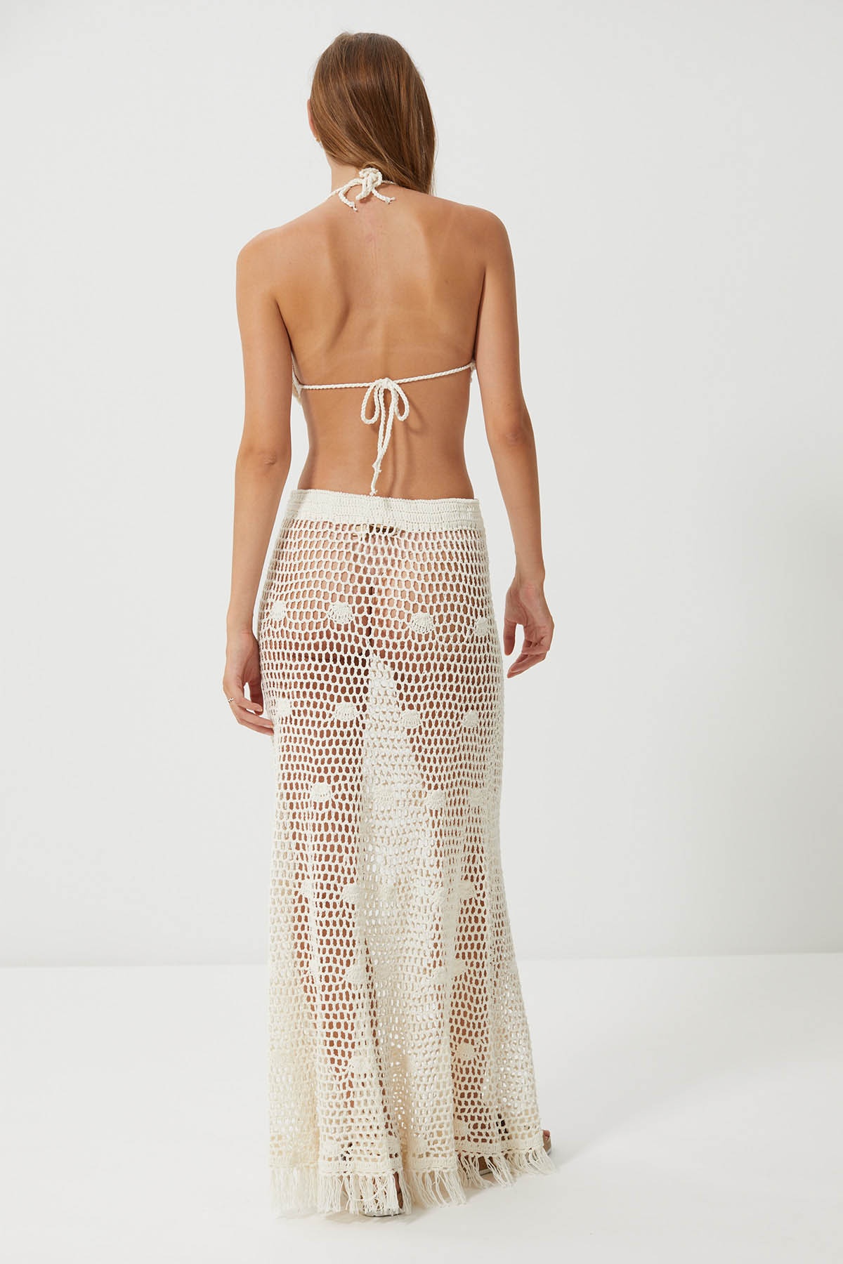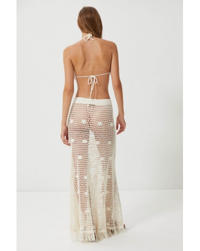 An iconic summer piece, the Corazon skirt enhances the silhouette with its long cut and hand-crocheted knit, evoking craftsmanship and seaside charm.