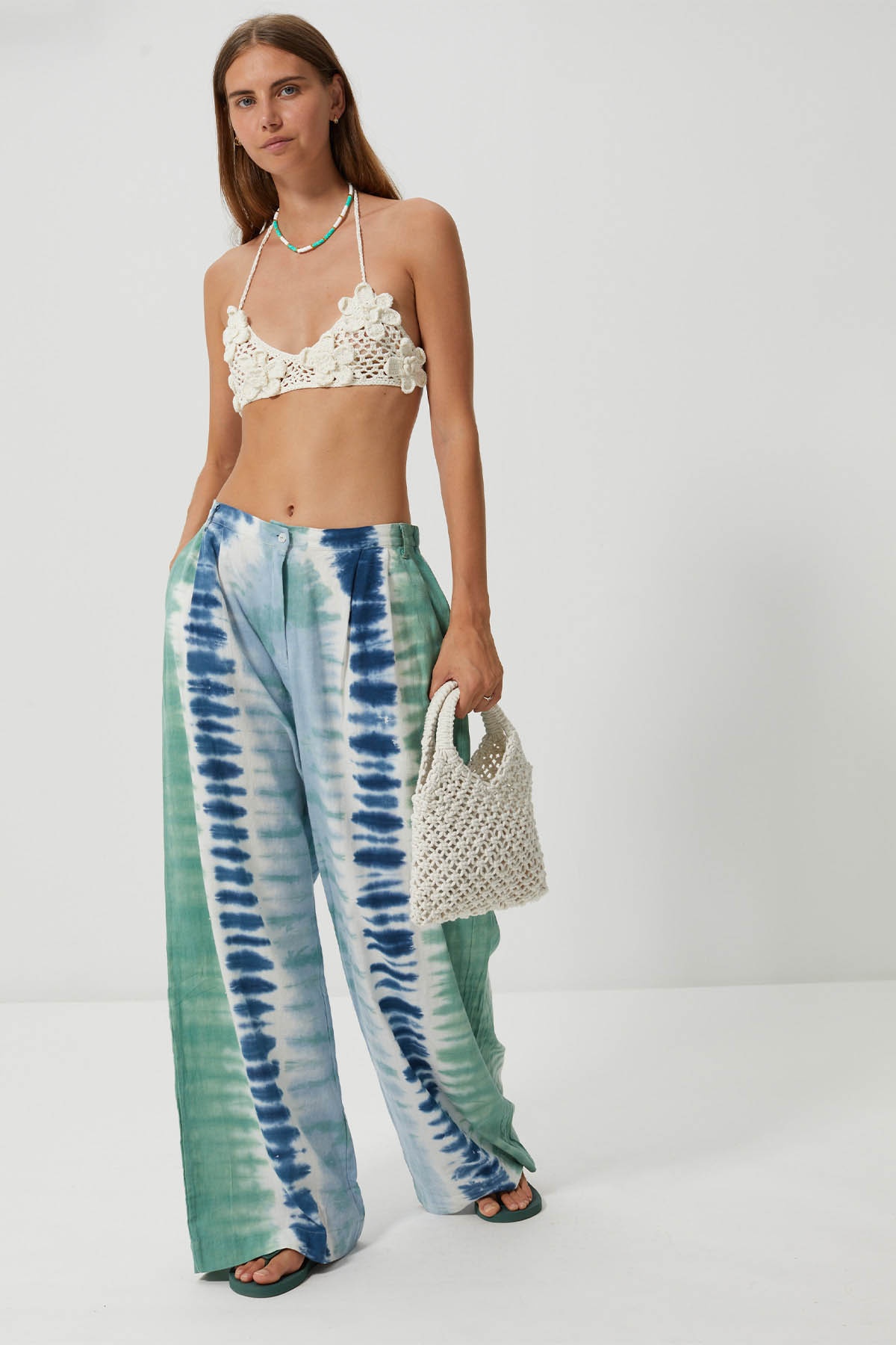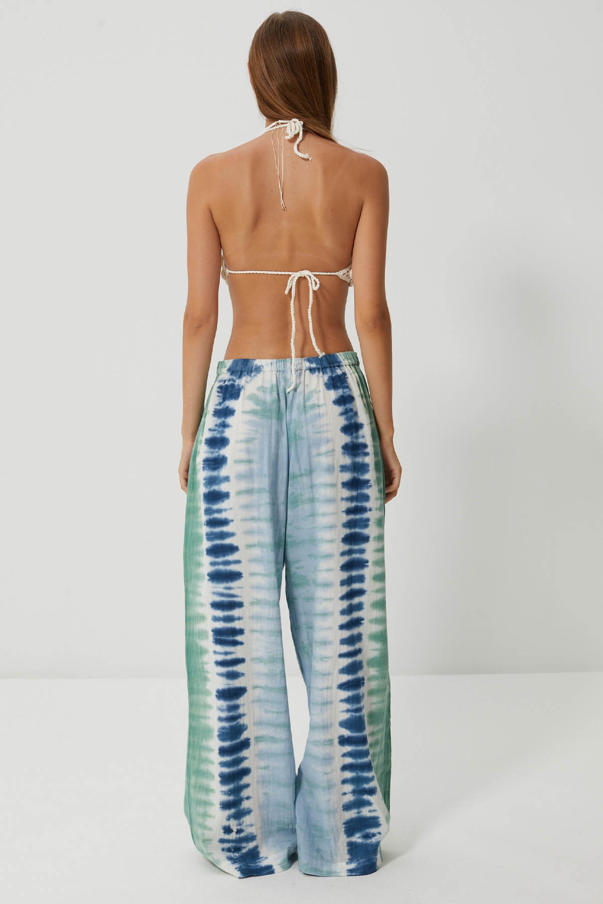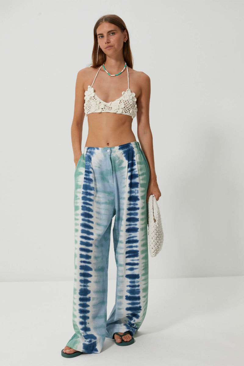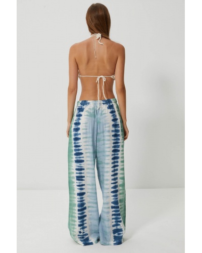 Discover the Barkha trousers, in a tie & dye print with fresh shades of blue and green, evoking the reflections of the sea in summer. Their wide, flowing cut hugs the body with lightness, while their structured high waist gives them a natural elegance.
