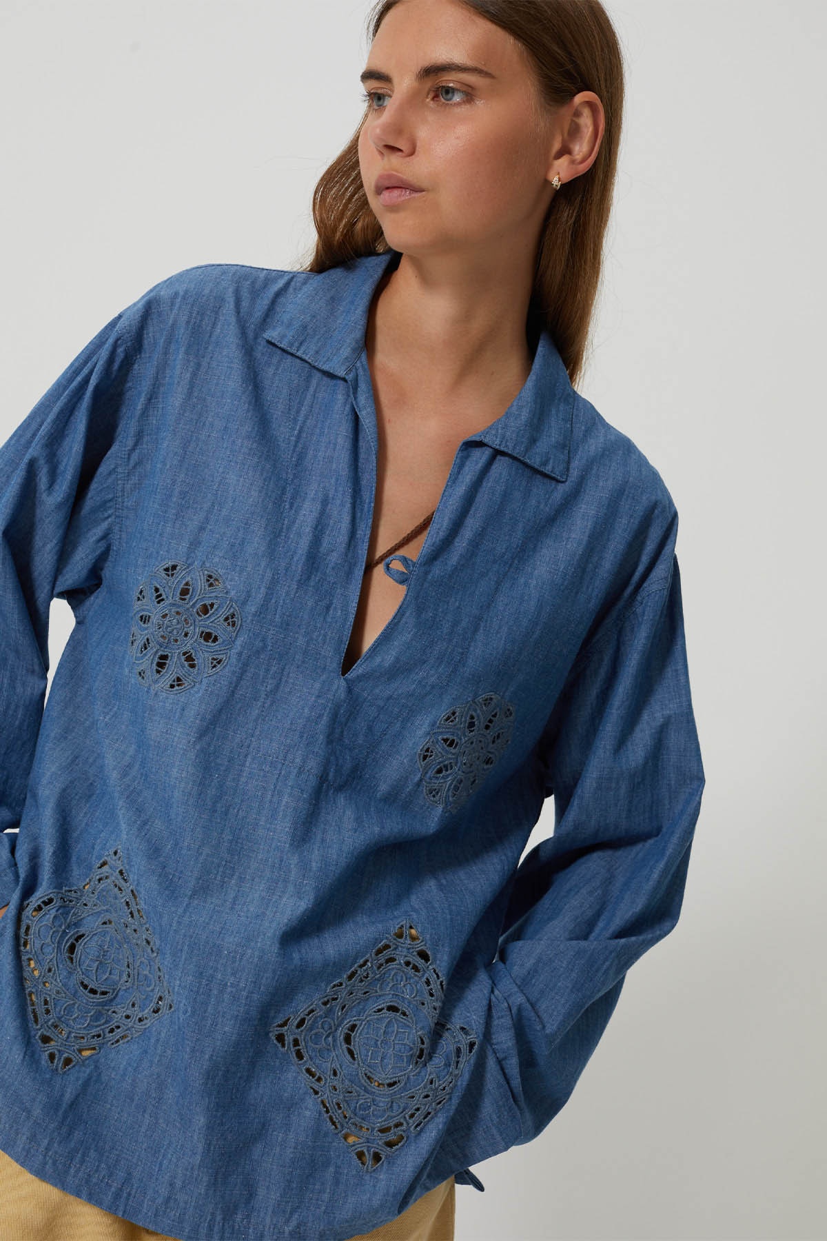 The Gomorah top combines charm and simplicity with its openwork embroidery and lightweight denim fabric. Its straight, slightly loose fit adapts to all body shapes, while its patterns subtly reveal the skin for a refined, modern effect.