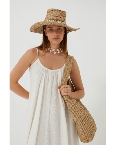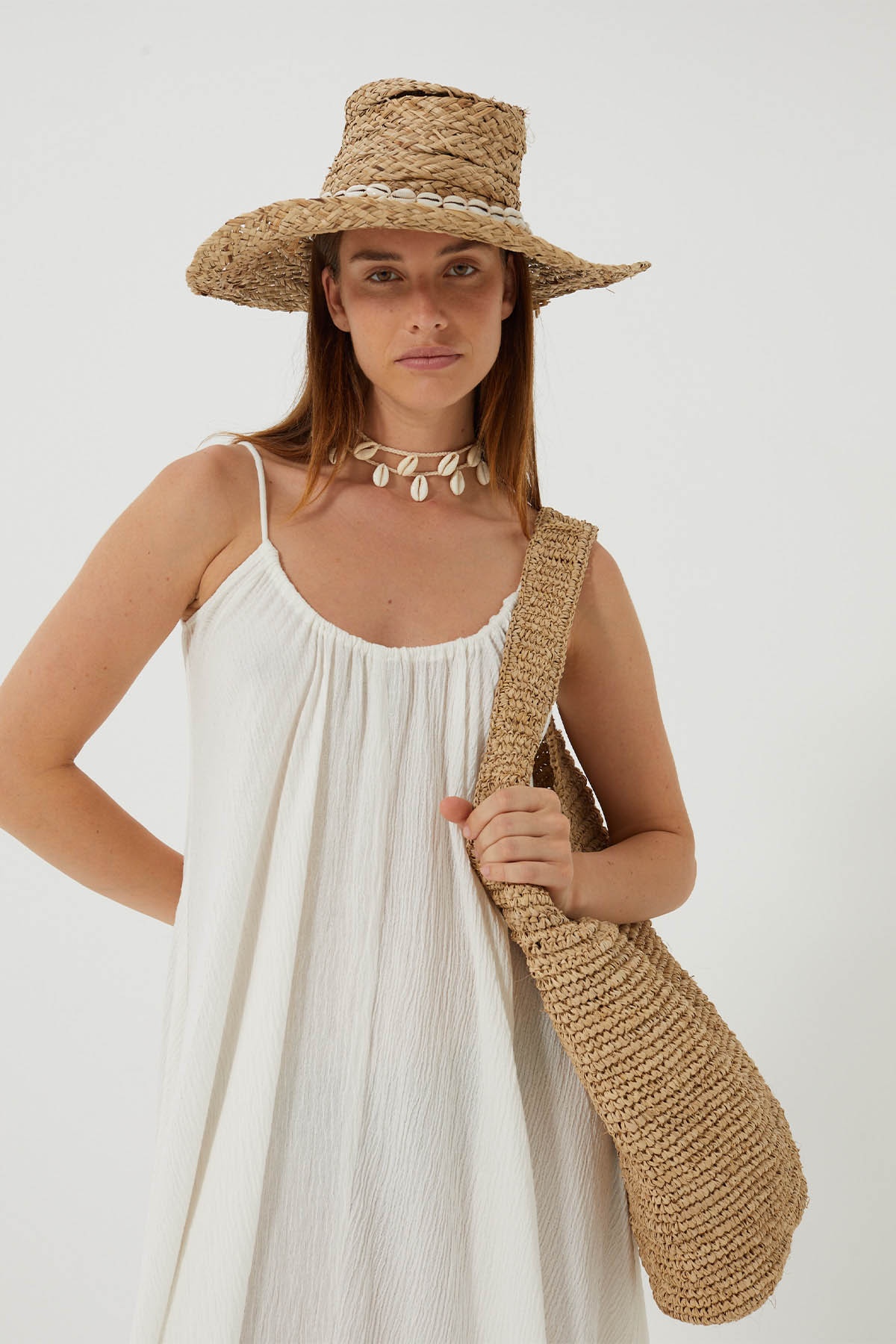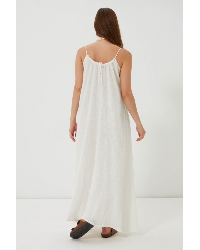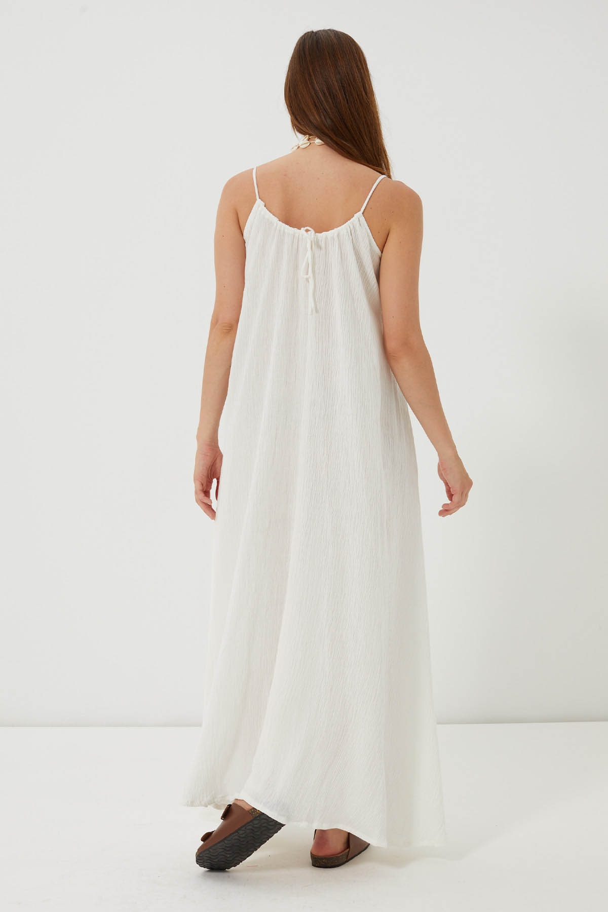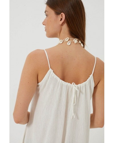 Its gathered collar and thin straps add a minimalist, feminine touch. It's the ideal dress for strolling along the seafront or lounging in the shade of palm trees.