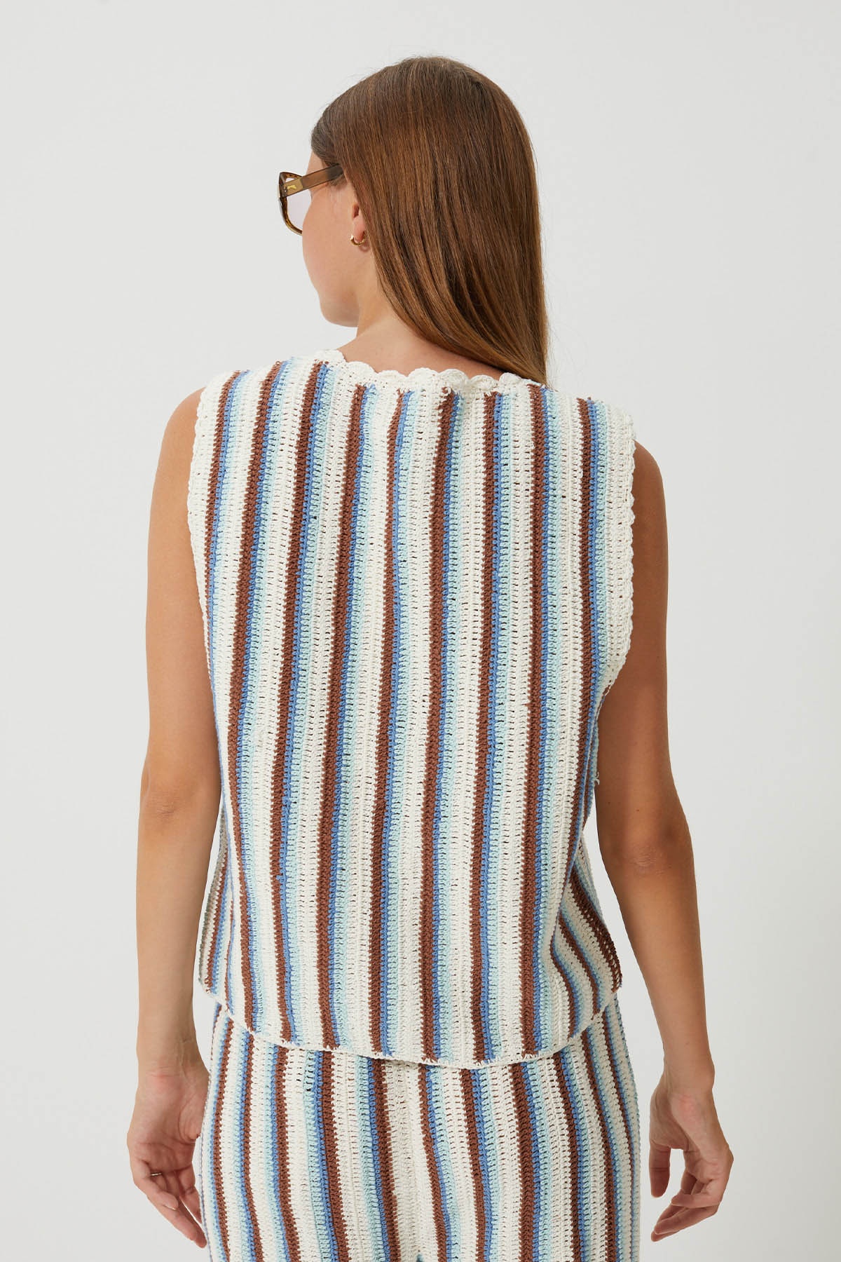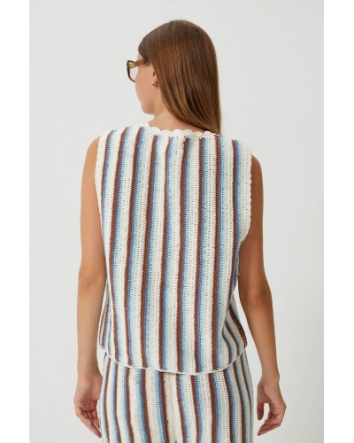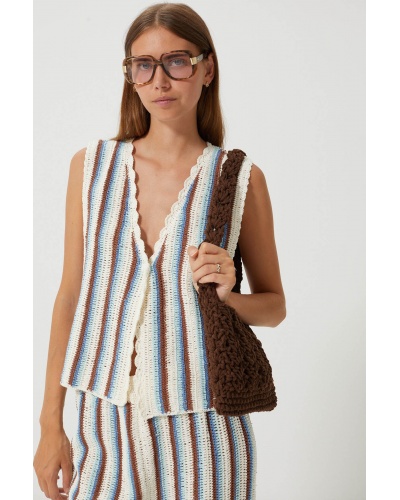 The Kaist jacket revisits the crochet spirit in a relaxed summer version. Striped in shades of ecru, sky blue and chocolate, it evokes the long summer days between sky and earth.