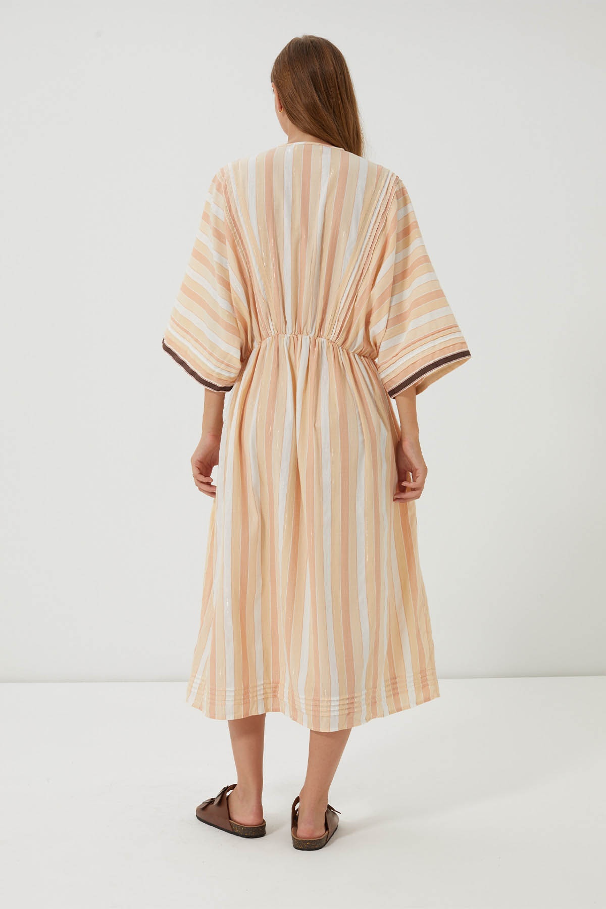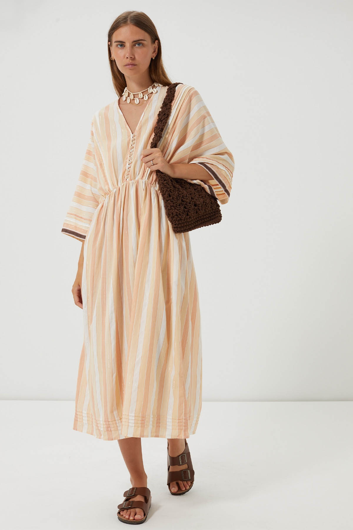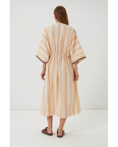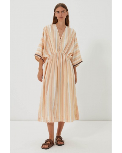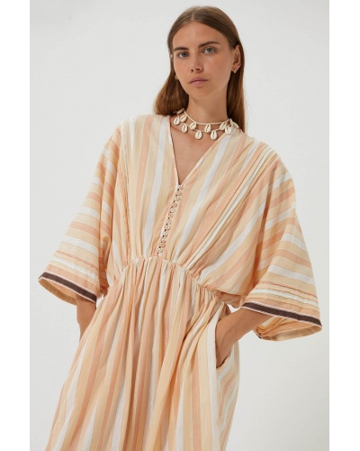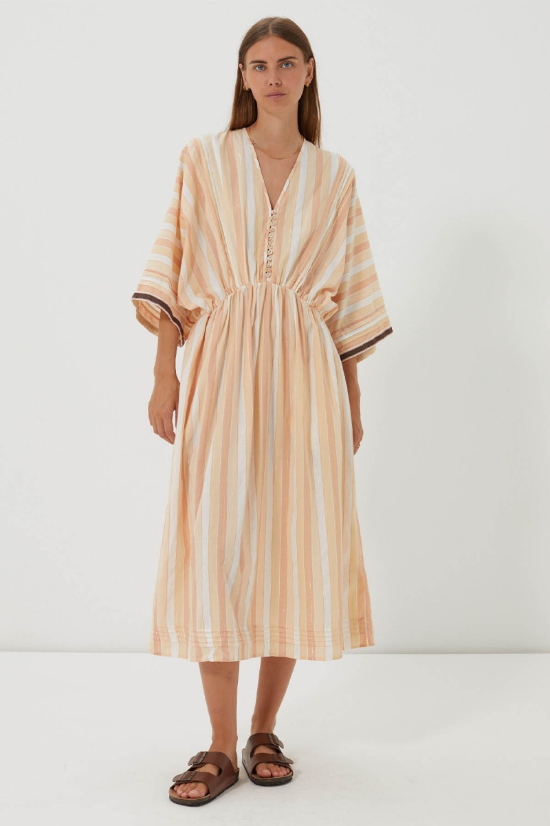 The Dimily dress evokes a soft, bohemian elegance with its pastel stripes and loose fit.