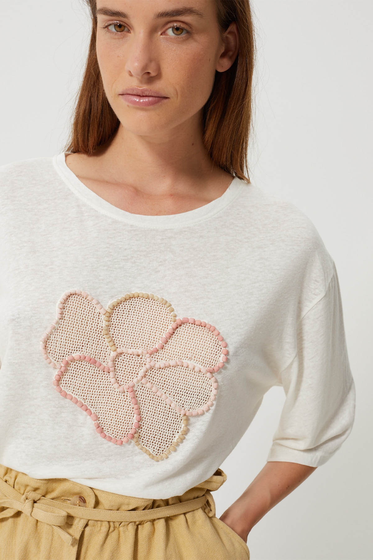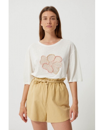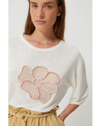 Discover the Hibiscus top, a relaxed-fit T-shirt that combines comfort with a bohemian spirit. Made from cotton jersey, it features a central floral embroidery in crochet and pearls: contrasting petals in soft shades.