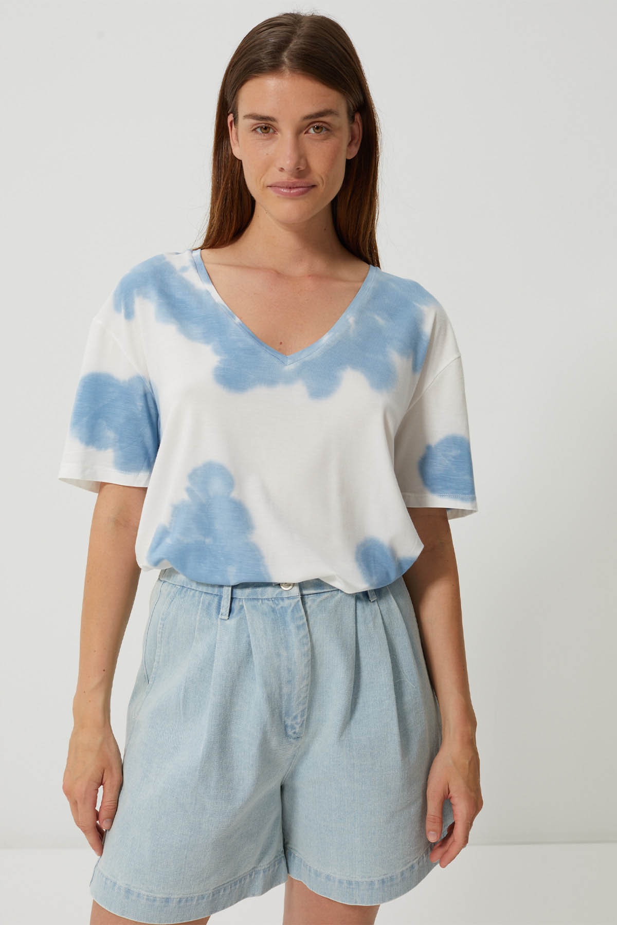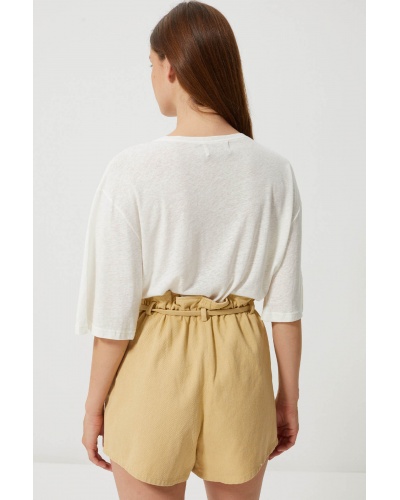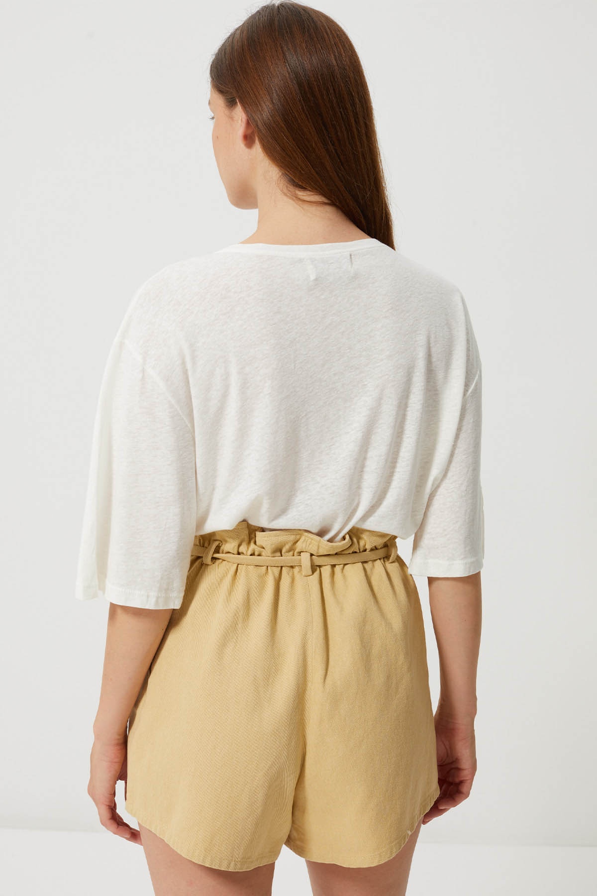 Slip into high-waisted shorts or light jeans for a cool summer silhouette.