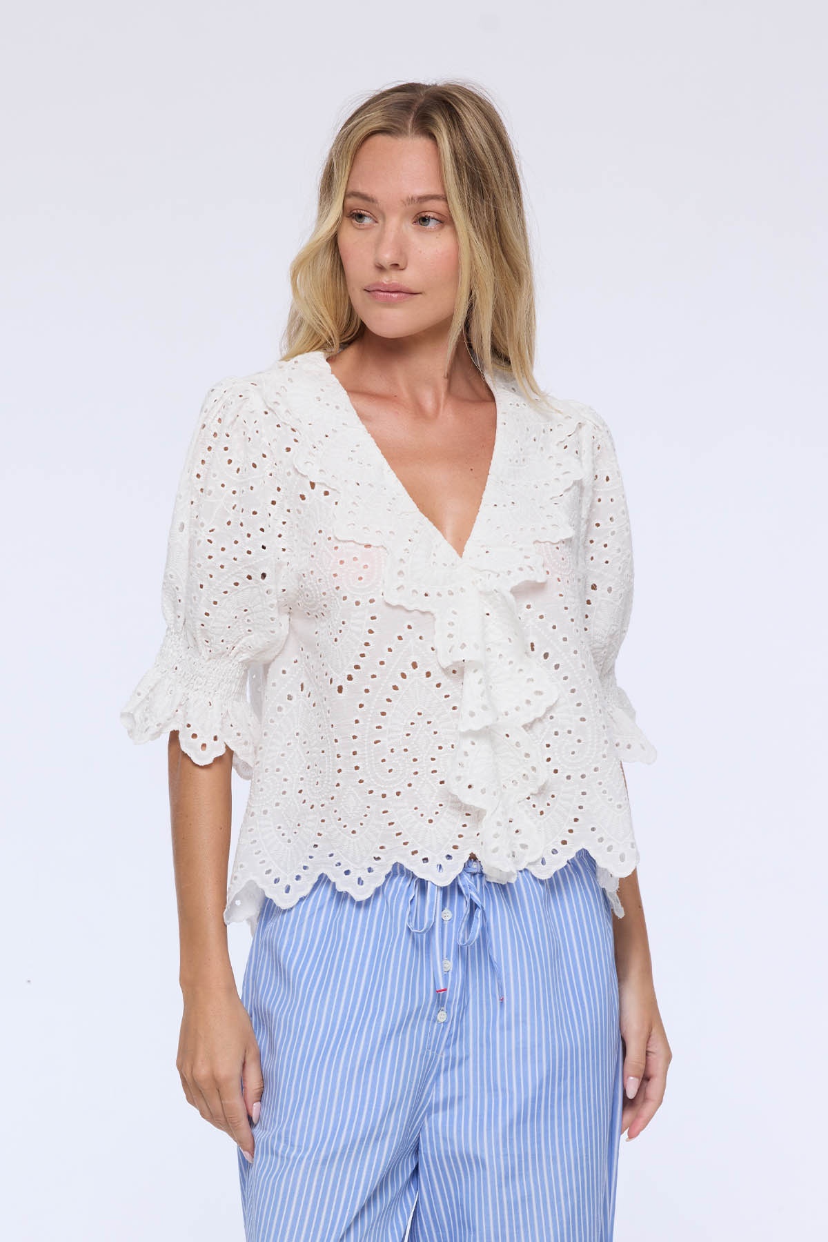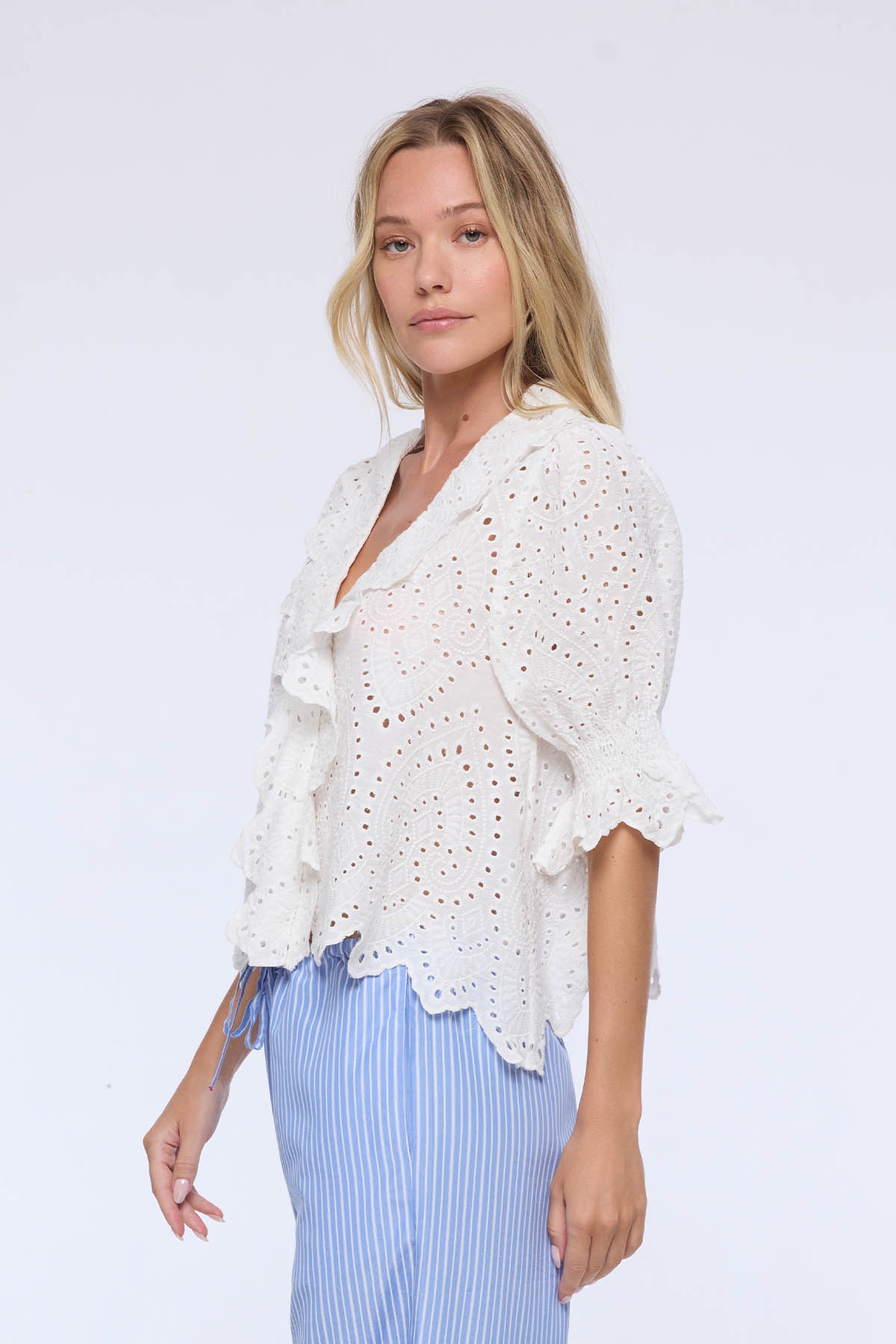 The Acadie blouse embodies the freshness and delicacy of the Spring-Summer 26 collection. Crafted from refined lace, it charms with its openwork cutouts and scalloped finishes that add texture and femininity to the silhouette.