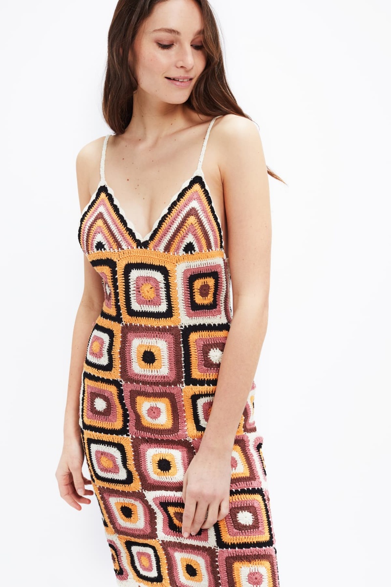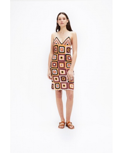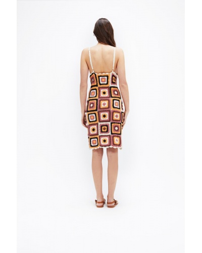 The Dojima mini dress is made up of a patchwork of small coloured squares crocheted by hand. Dare to go for a total seventies look by combining it with a basket and lace-up sandals.