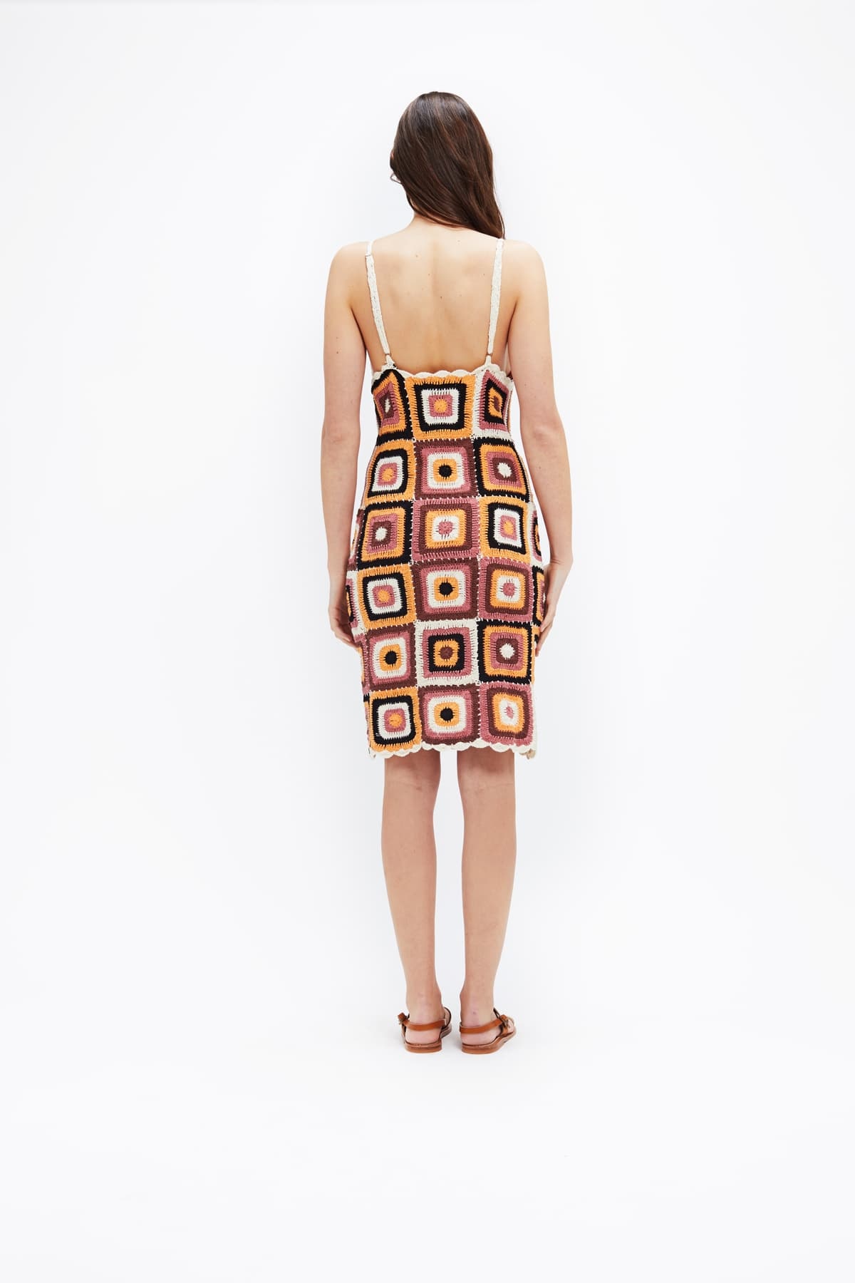 The Dojima mini dress is made up of a patchwork of small coloured squares crocheted by hand. Dare to go for a total seventies look by combining it with a basket and lace-up sandals.