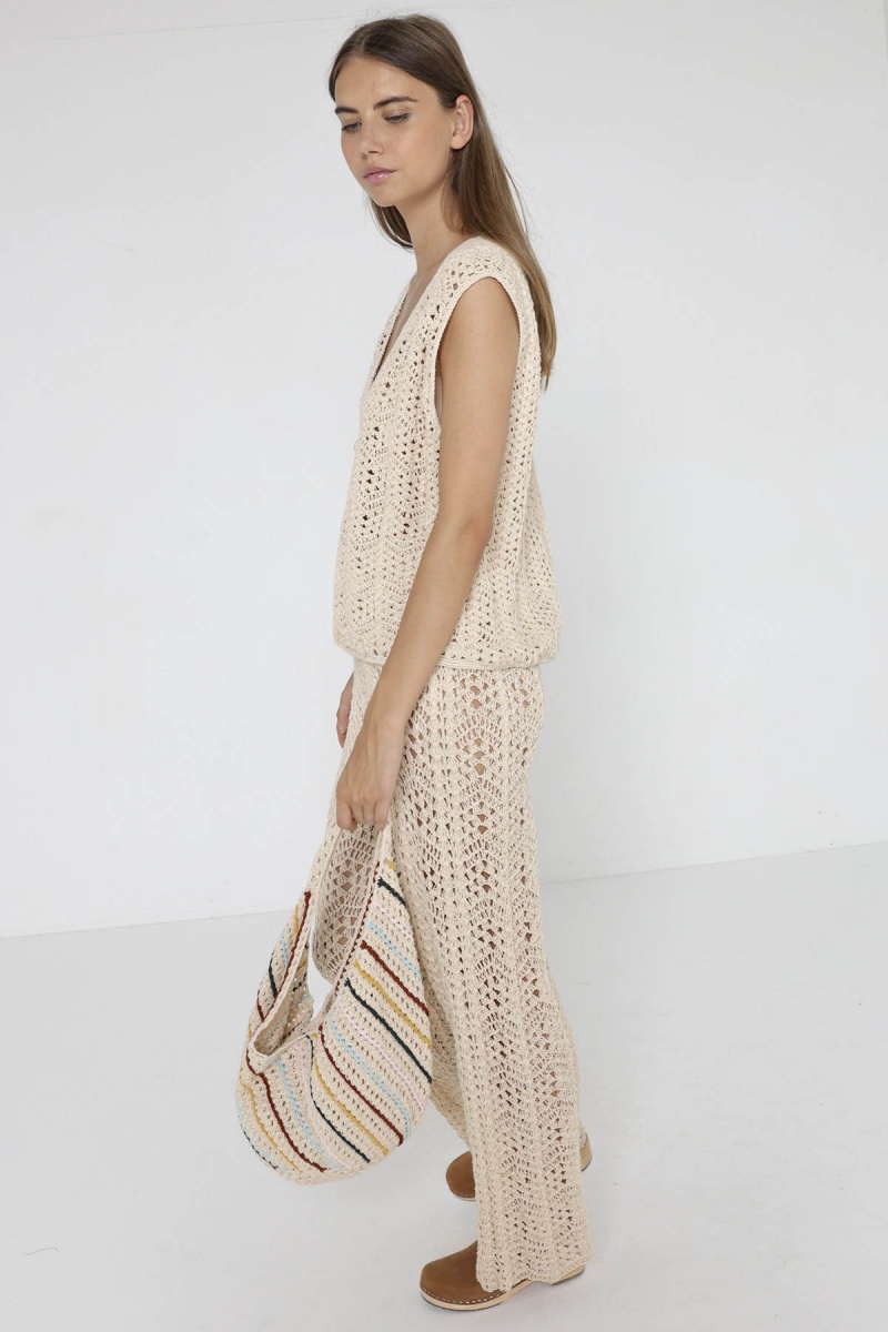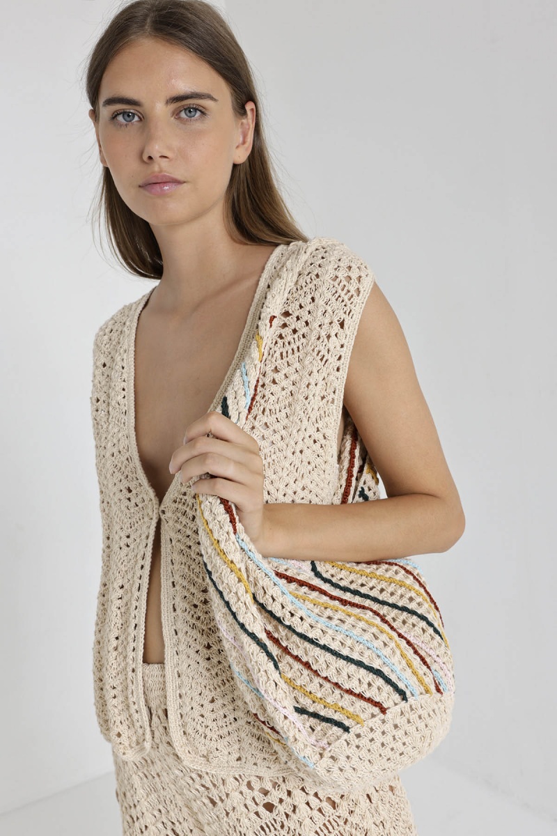 Le sac Alelu, conçu en crochet, adopte une forme banane tendance. Avec ses rayures colorées et son anse pratique, il devient l'accessoire idéal pour ajouter une touche bohème à votre tenue estivale. Le sac Alelu est votre compagnon idéal pour une journée décontractée à la plage ou lors d'une sortie en ville.
