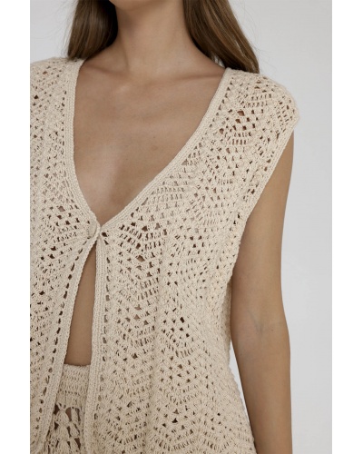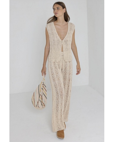 Its natural beige hue works perfectly with the matching crochet trousers or shorts for an elegant, coordinated ensemble. You can also pair it with canvas trousers or jeans for a casual, on-trend look.