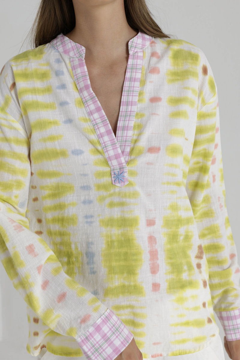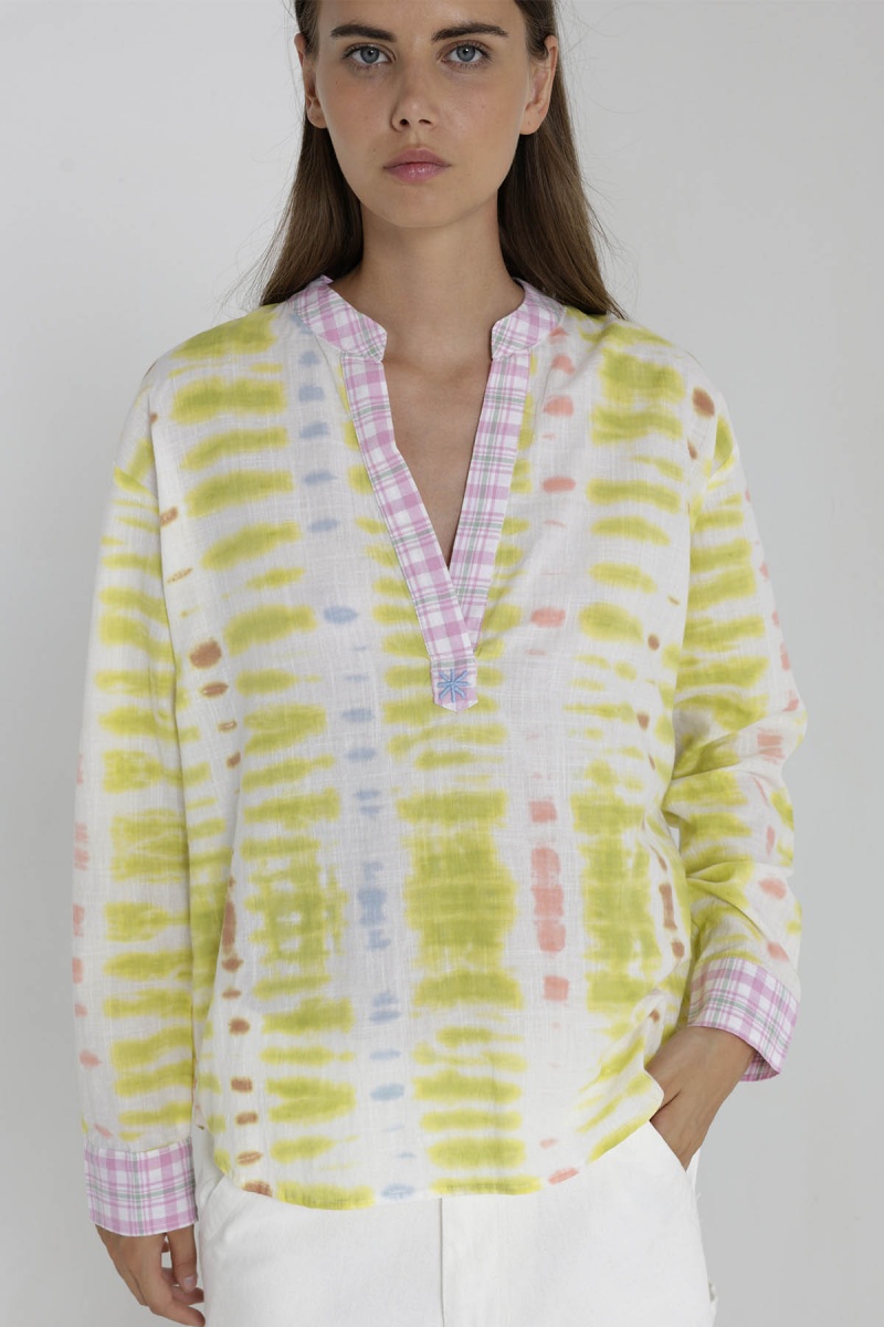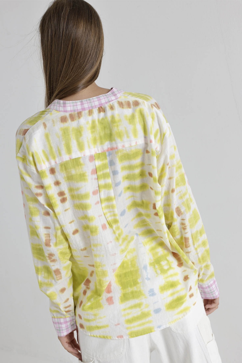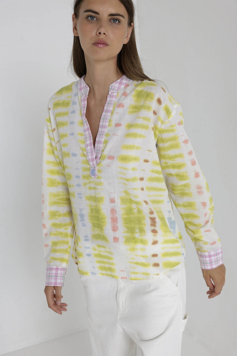 Let yourself be seduced by the Lizbo blouse and its harmonious combination of patterns. The cuffs and neckline have a check pattern, while the rest of the garment features an art dye motif.