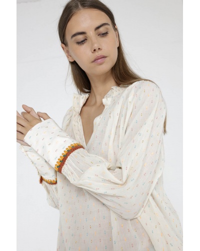 The Manon blouse, a variation on our iconic cut, is back this season. Made from lightweight cotton, it features meticulously embroidered coloured dots and a frieze of orange shades on the cuffs.