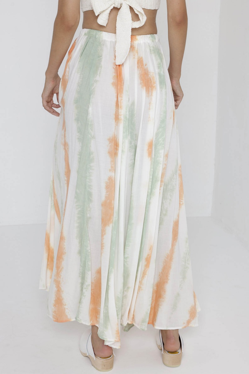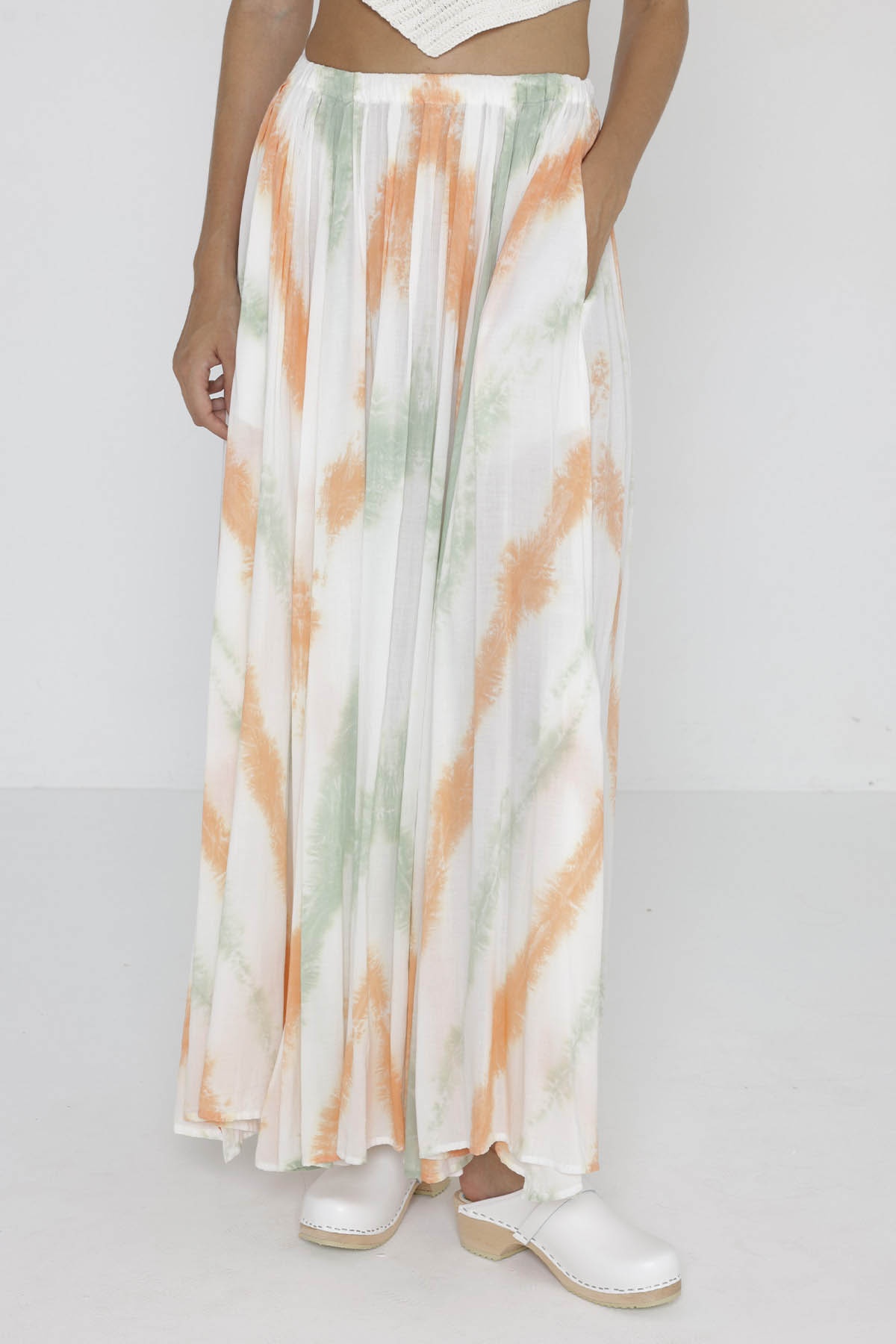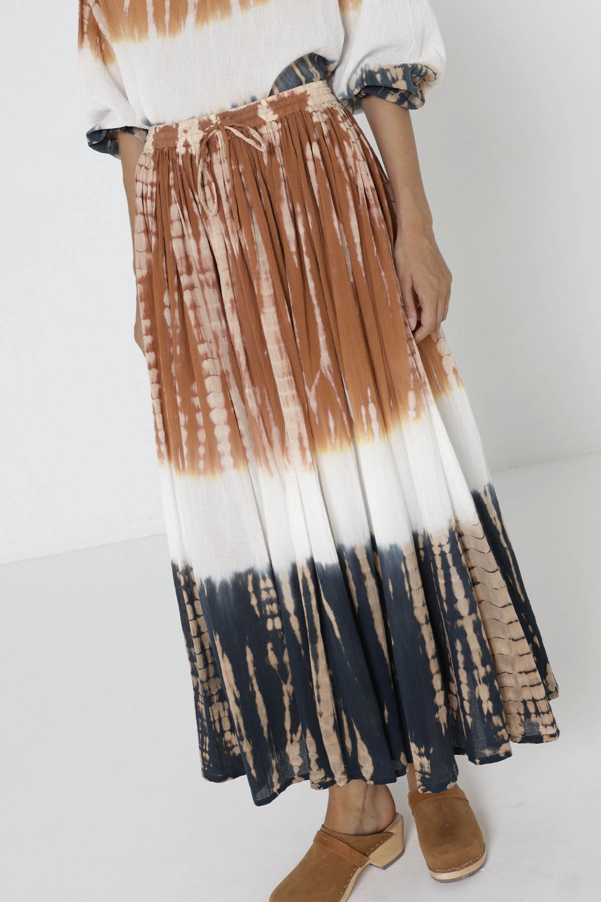 The MBK long skirt, with its art dye pattern, adds a unique aesthetic to your look.