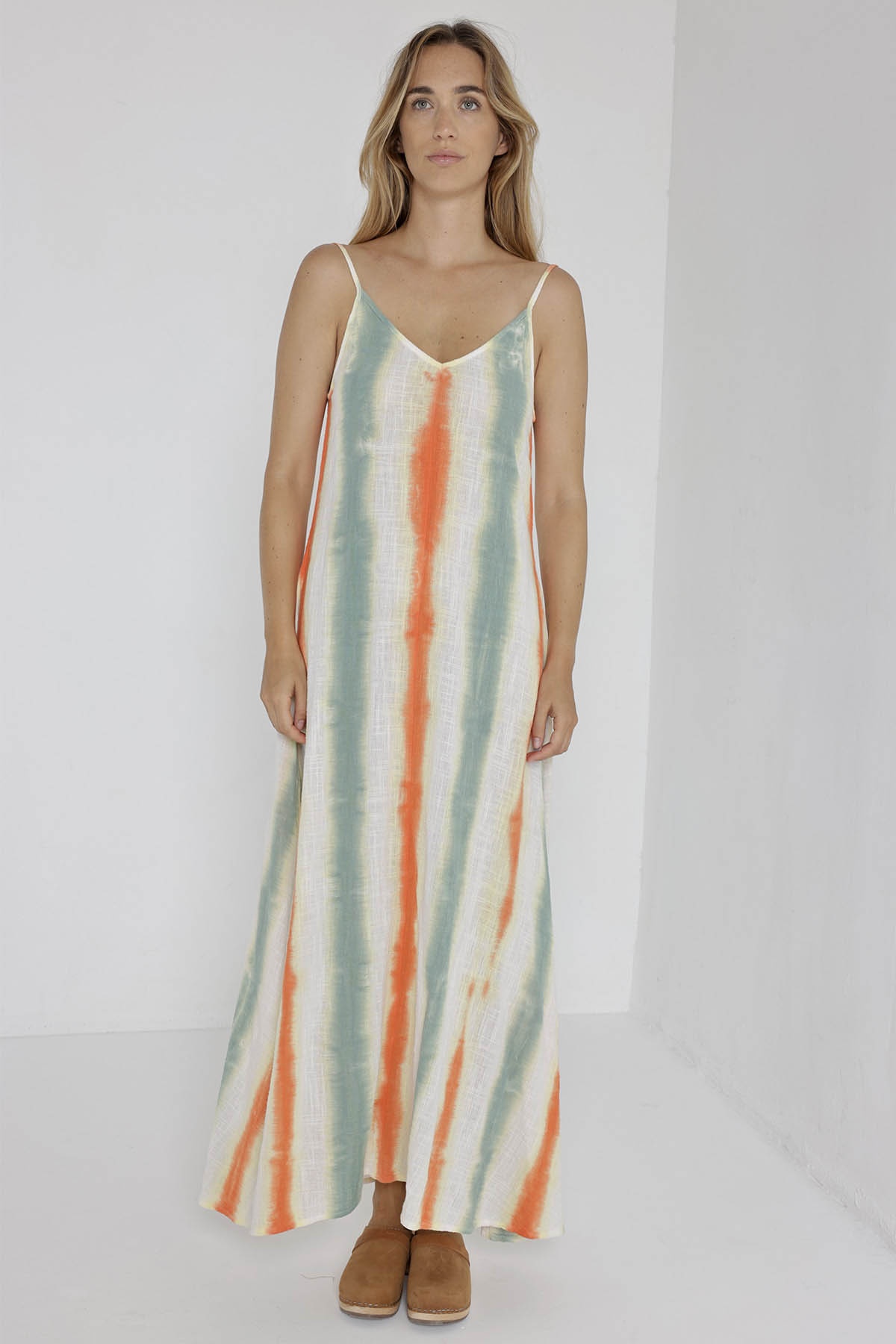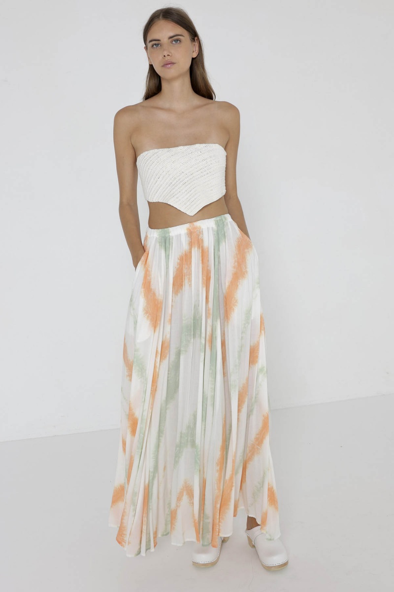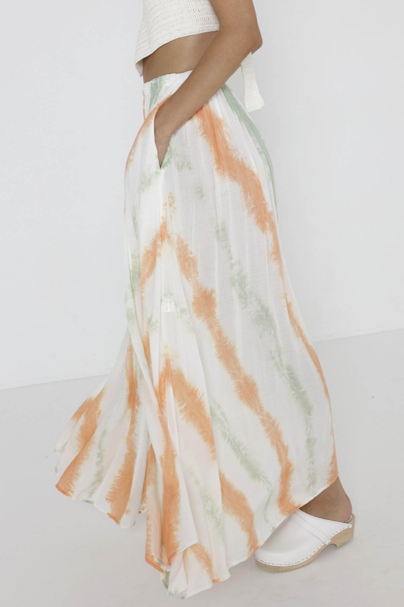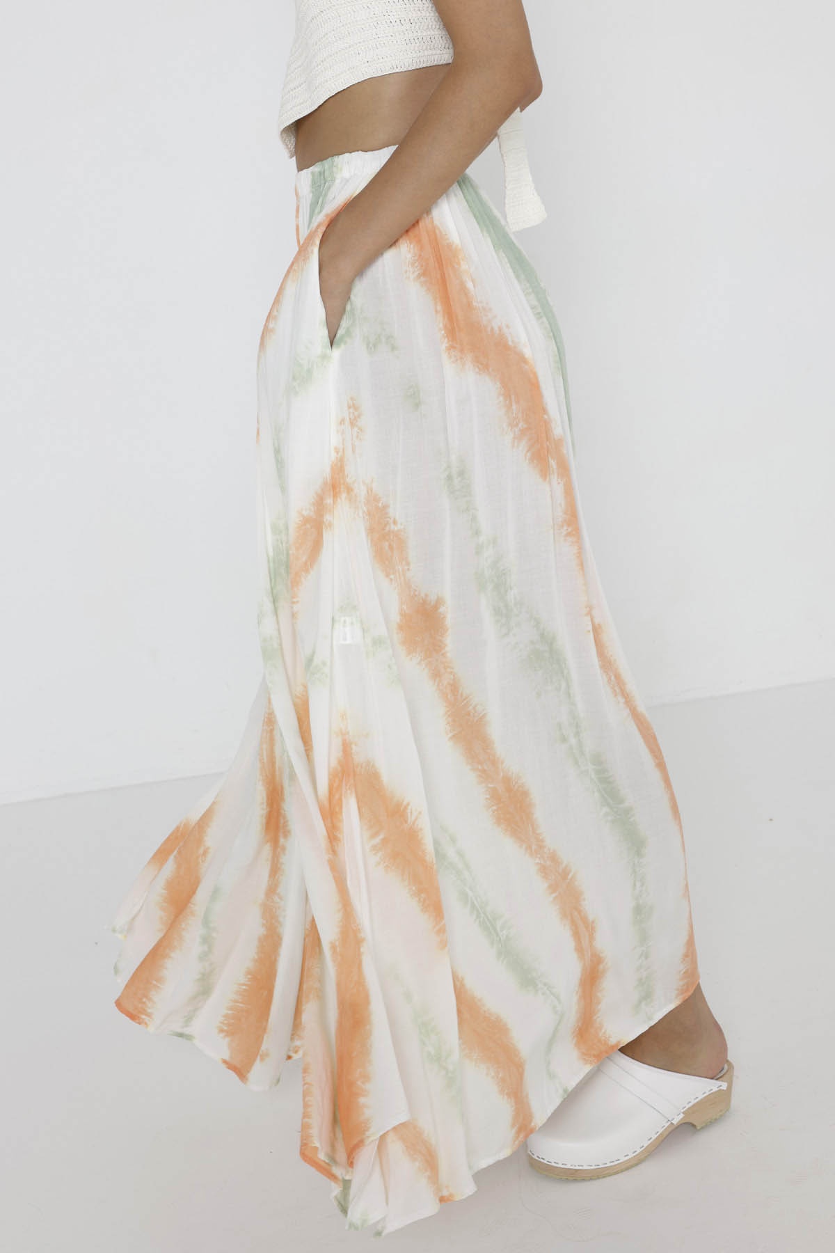 The MBK long skirt, with its art dye pattern, adds a unique aesthetic to your look.