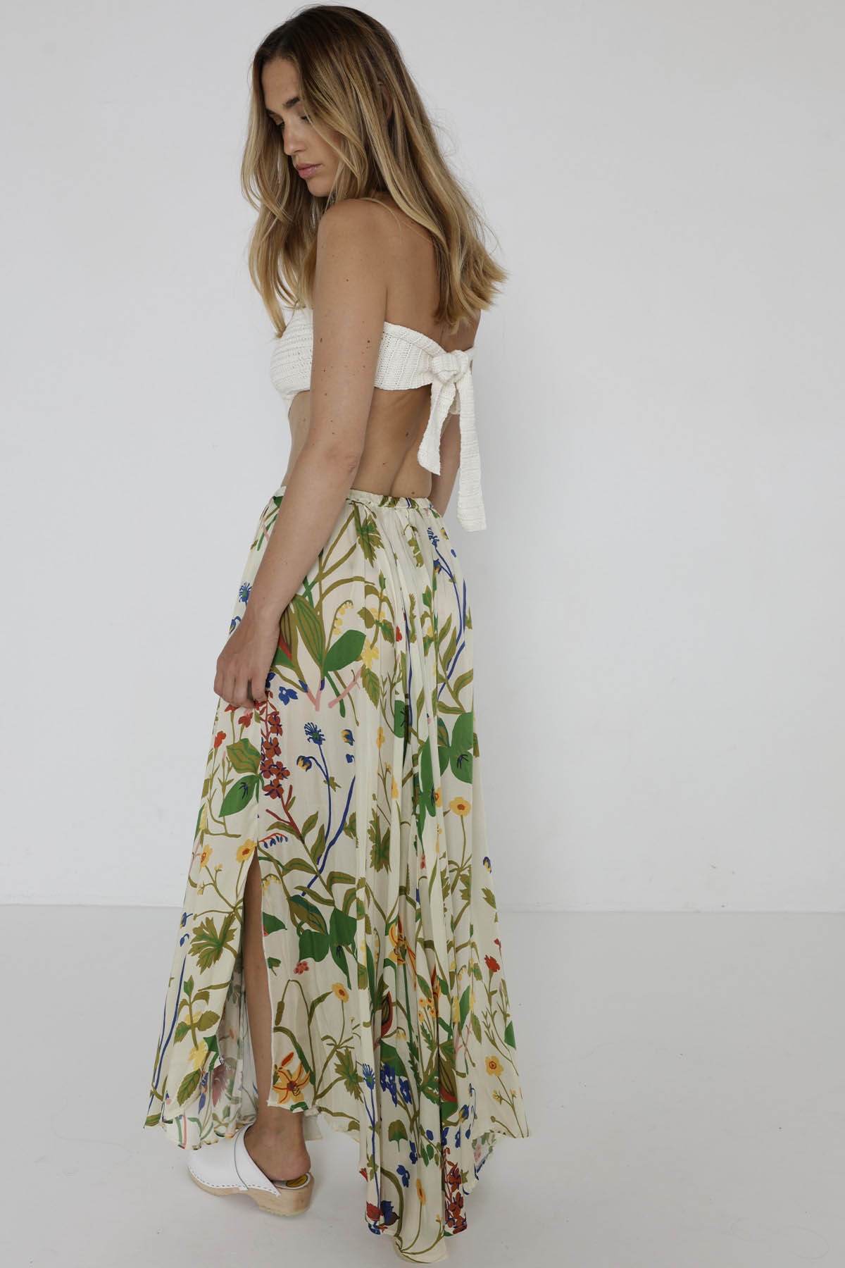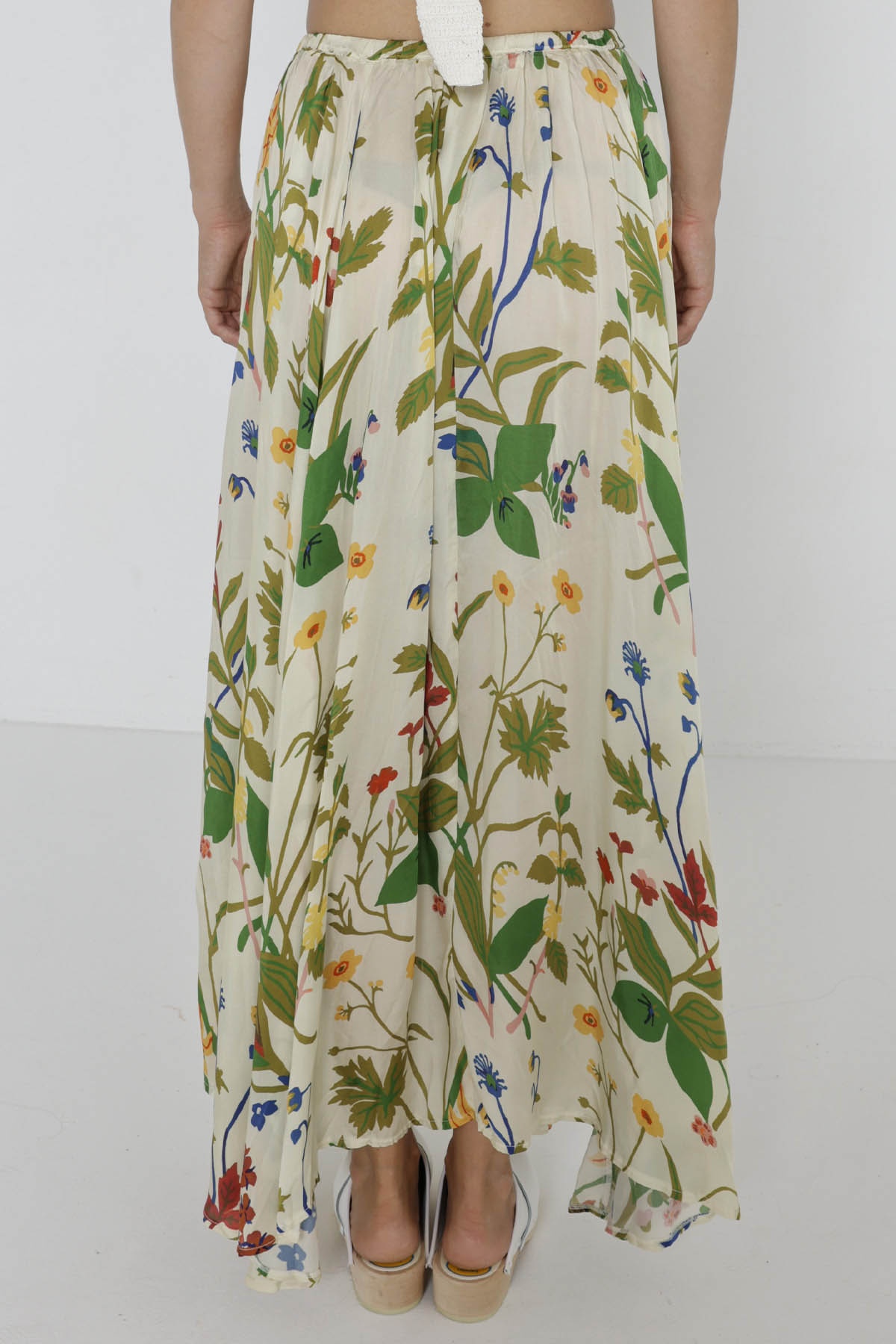 The Nelida satin skirt gives you a long, voluminous silhouette embellished with a delicate floral motif. Its subtle side slits offer a seductive glimpse of your legs, creating a captivating effect with every movement.