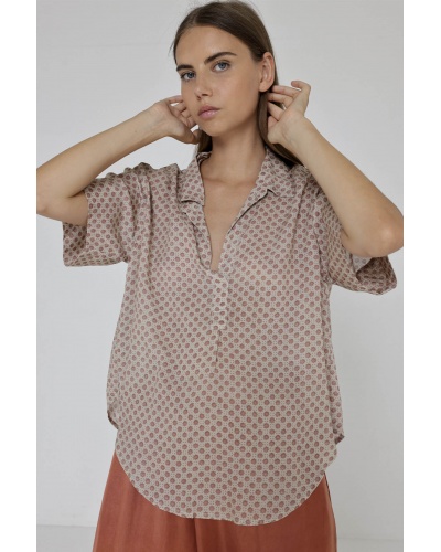 The Rolio blouse offers an elegant silhouette with its short sleeves and shirt collar, making it ideal for sunny days.
