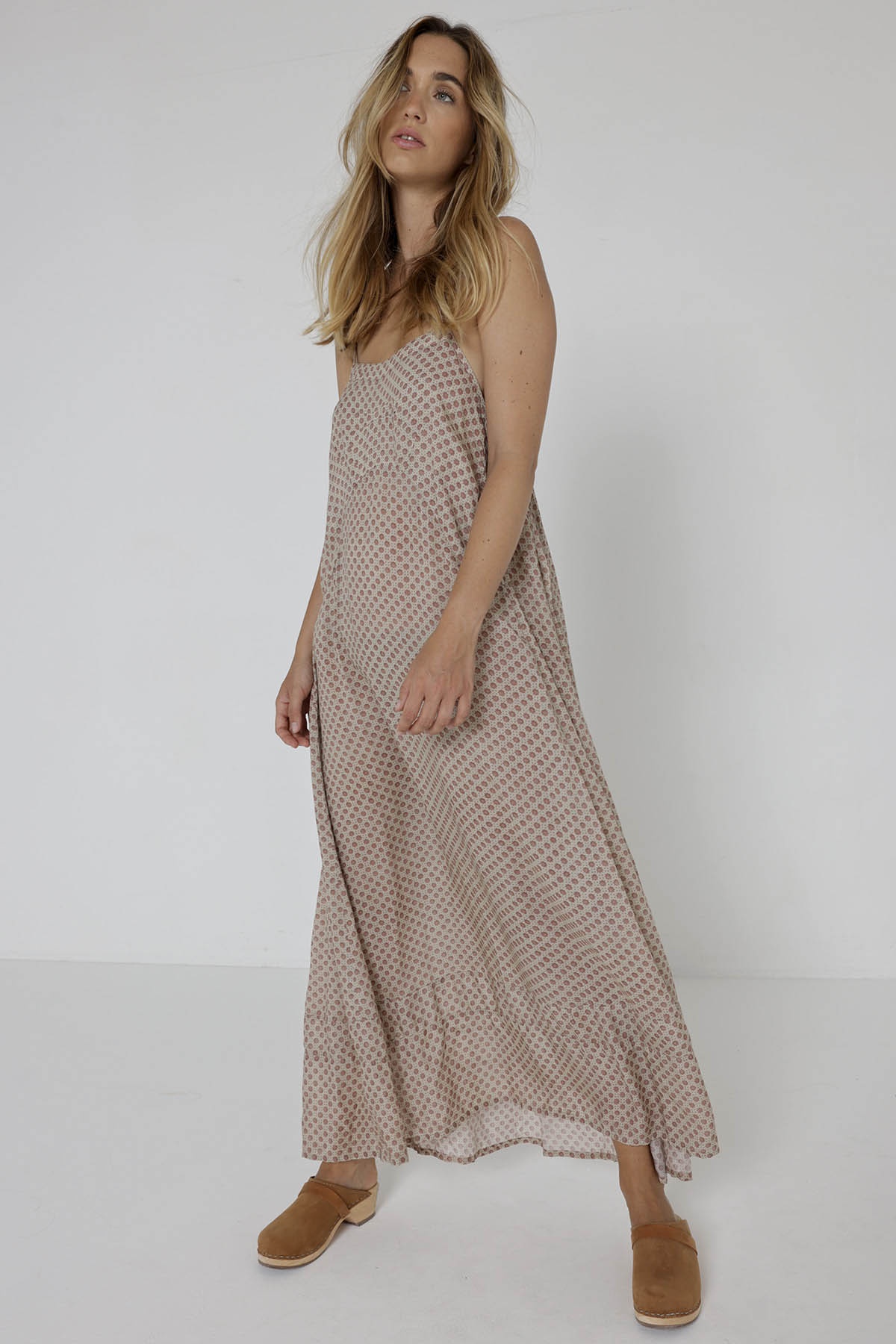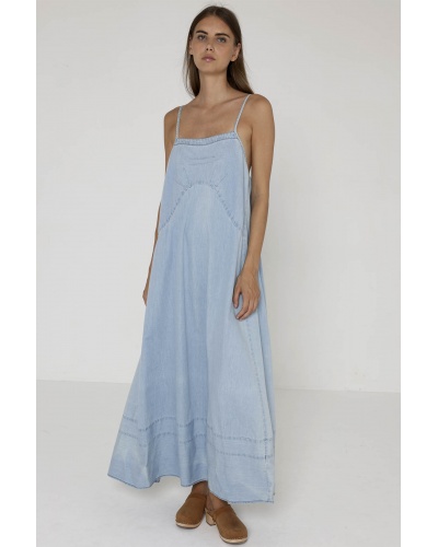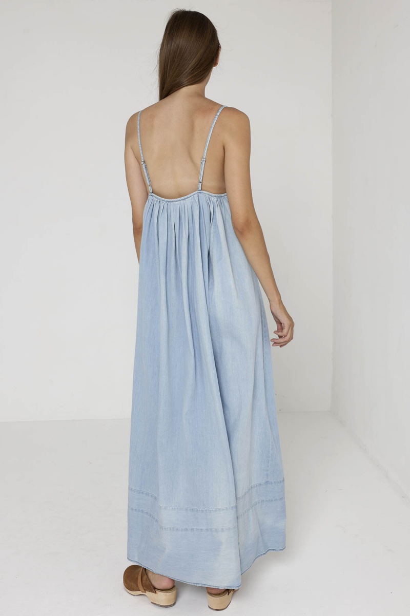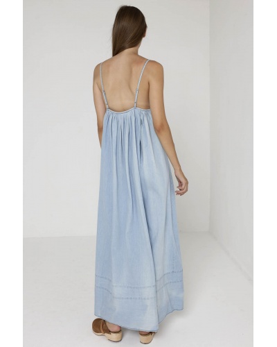 Plain satin maxi dress . Loose fit . Sweetheart neckline with button closure . 3/4 puffed sleeves . Buttoned cuffs . Italian side...