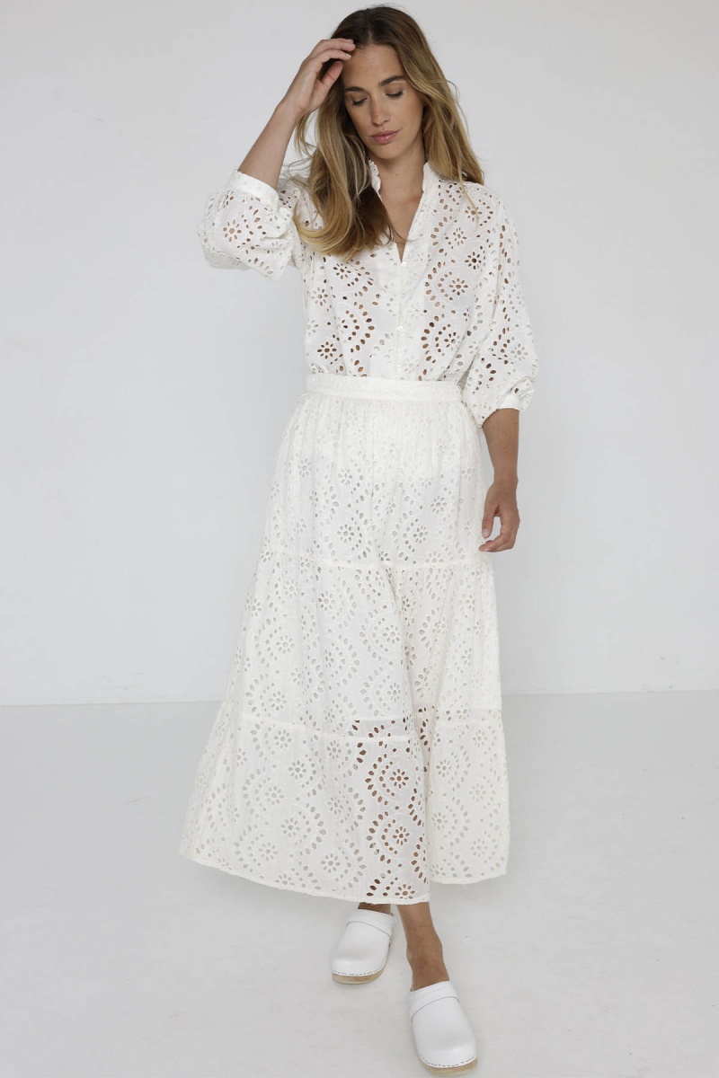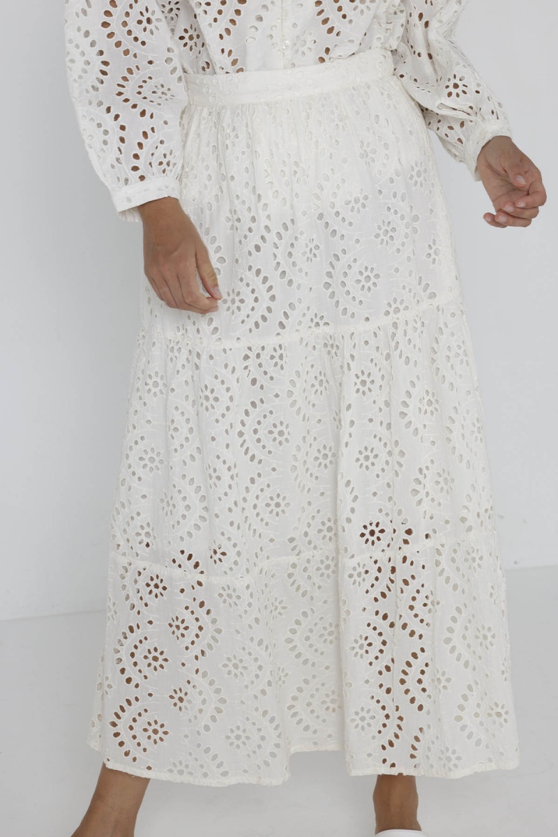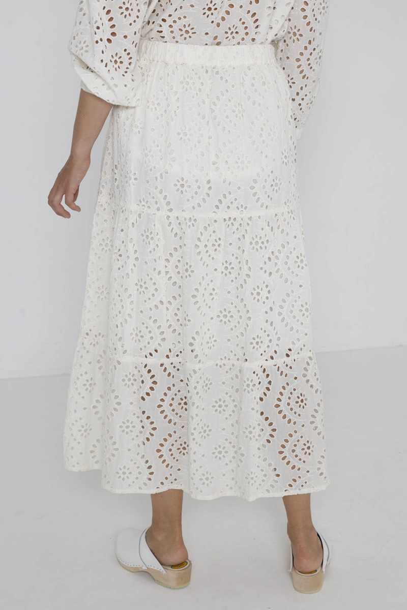 Crafted from delicate lace, the Morena maxi skirt features three ruffles for an elegant, romantic look. Its openwork, sheer fabric creates an airy, feminine effect, perfect for sunny days. Practical and functional, it has discreet pockets.