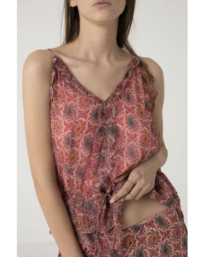 Adorned with a delicate paisley print in shades of red and pink, it's perfect for warm days.
