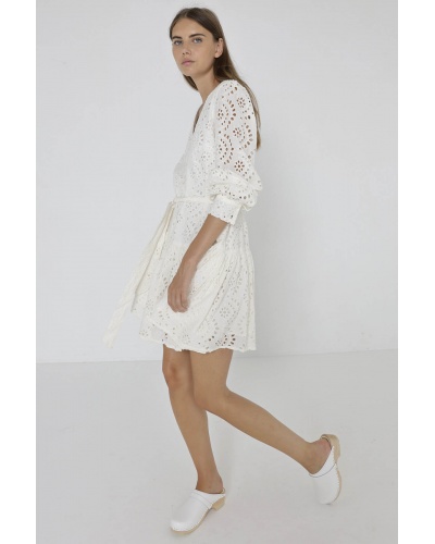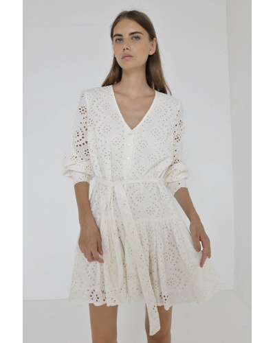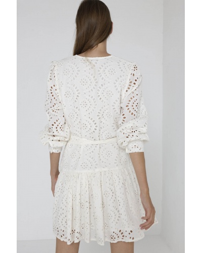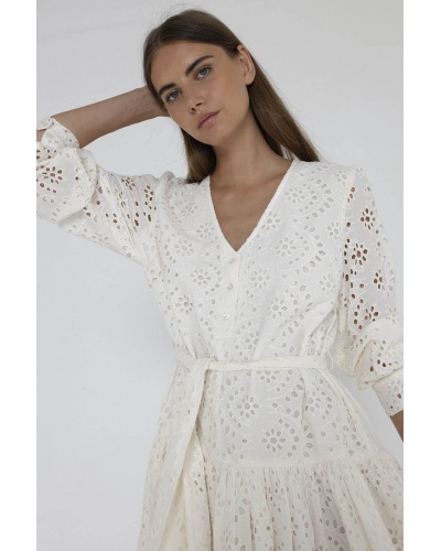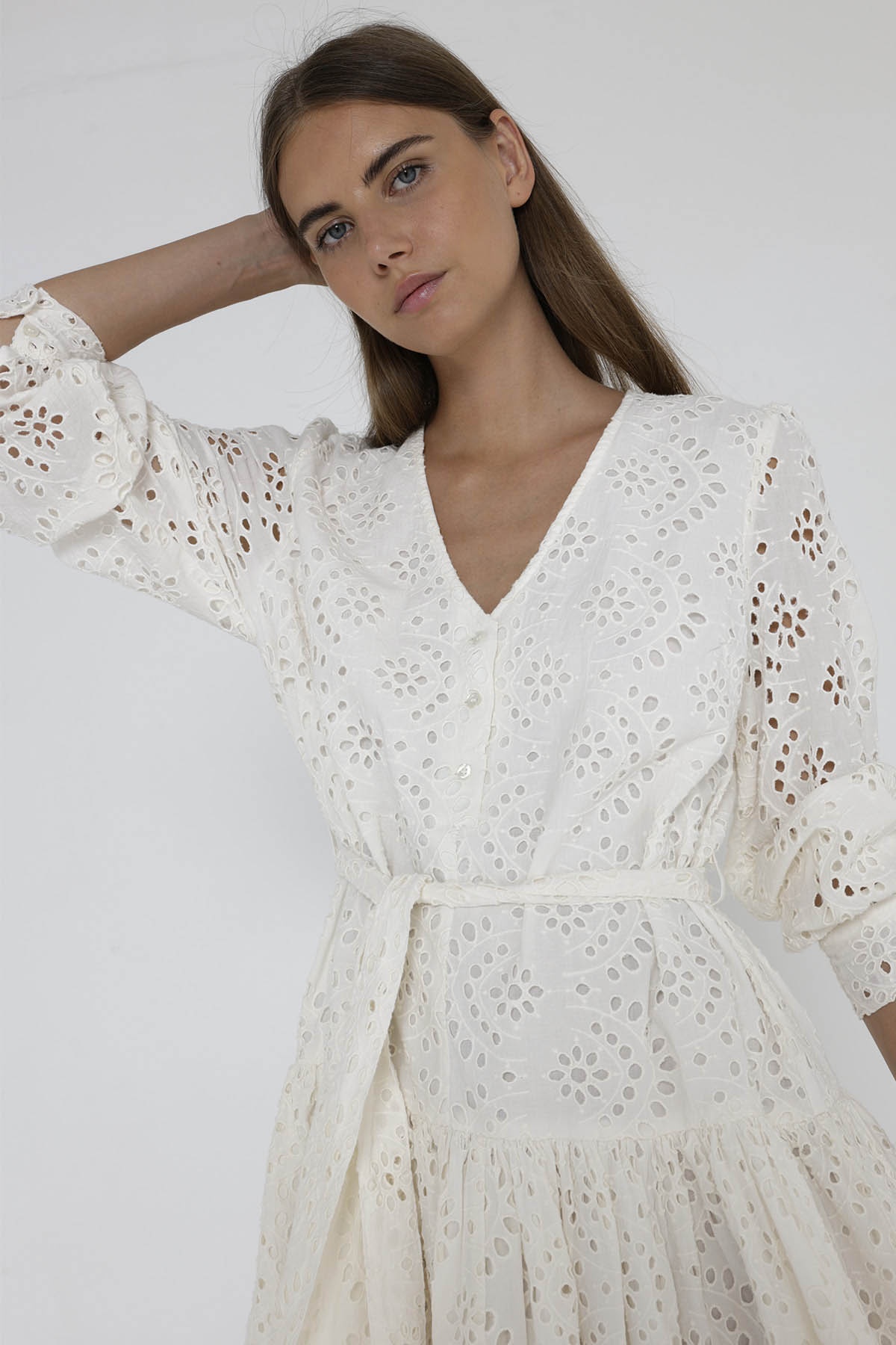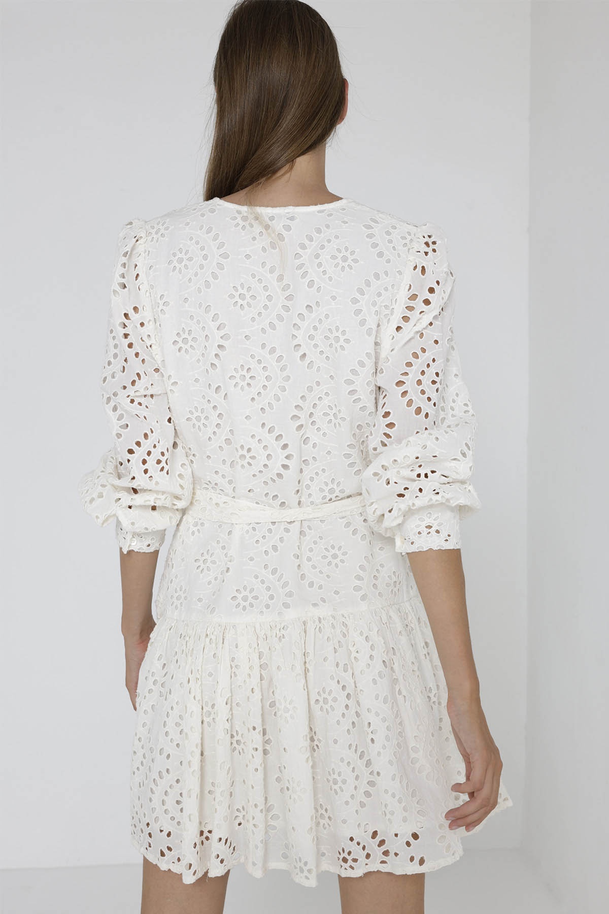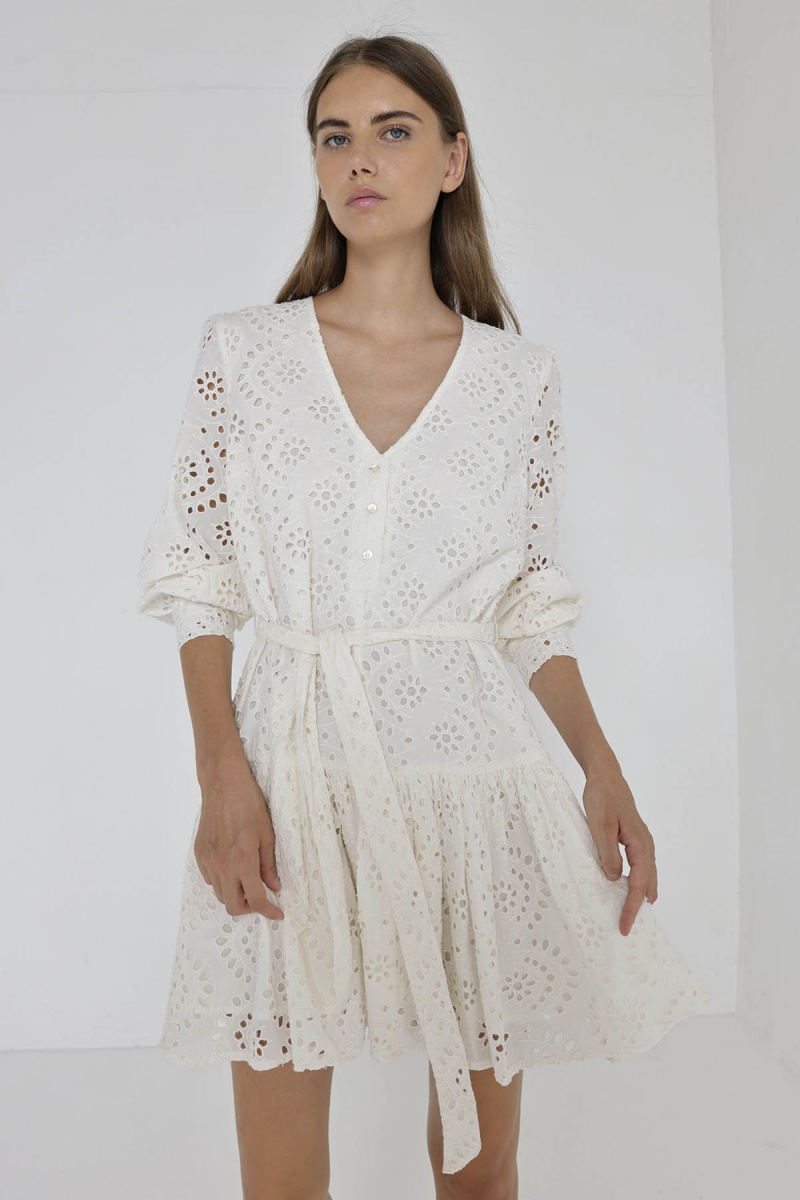 The Matilda dress combines elegance and sophistication with its white lace pattern.