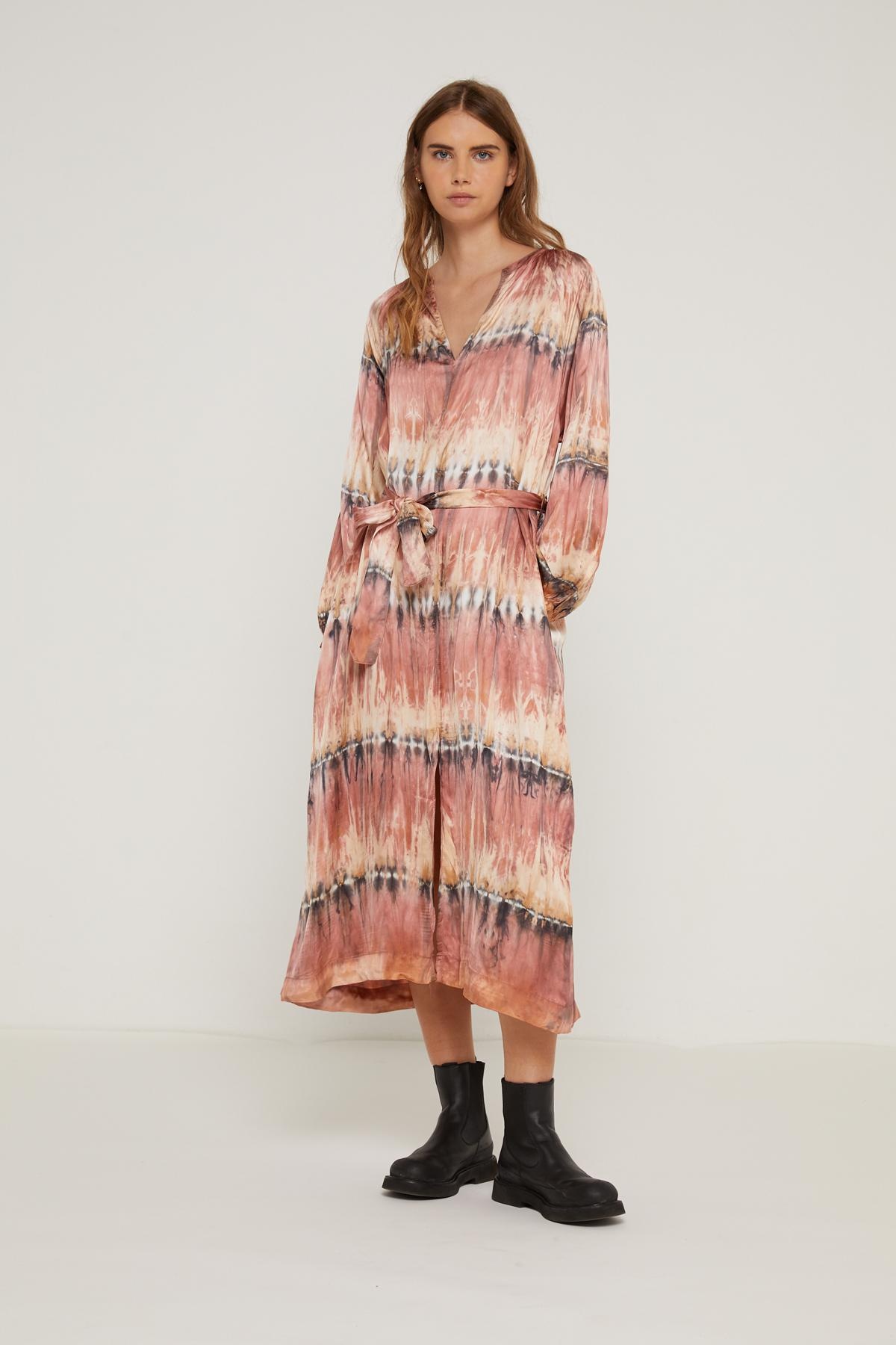 Robe longue cache-coeur en satin à motif . Coupe ample . Encolure froncée avec bouton col . Taille élastiquée au dos . Manches longues ....