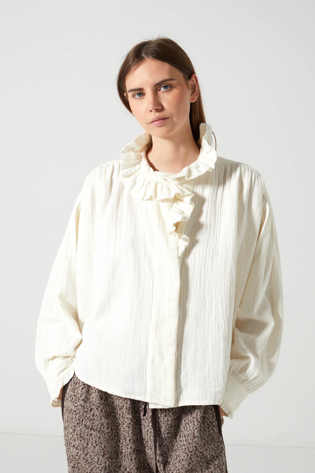 Chemise en gaze de coton et volant . Coupe large . Base arrondie . Col montant avec volant . Patte de boutonnage cachée . Manches...