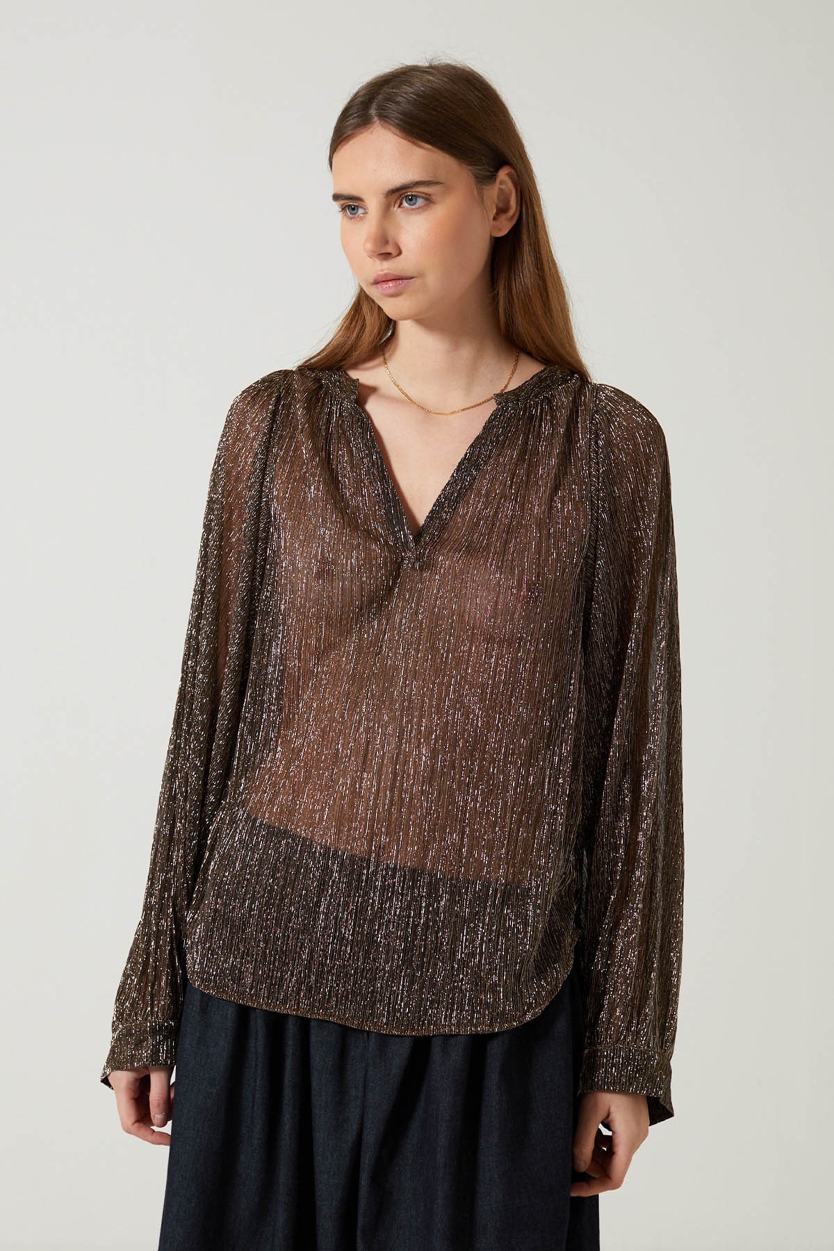Blouse en lurex dorée . Coupe droite . Encolure V . Manches longues  . Base arrondie . Plus longue à l'arrière qu'à l'avant...