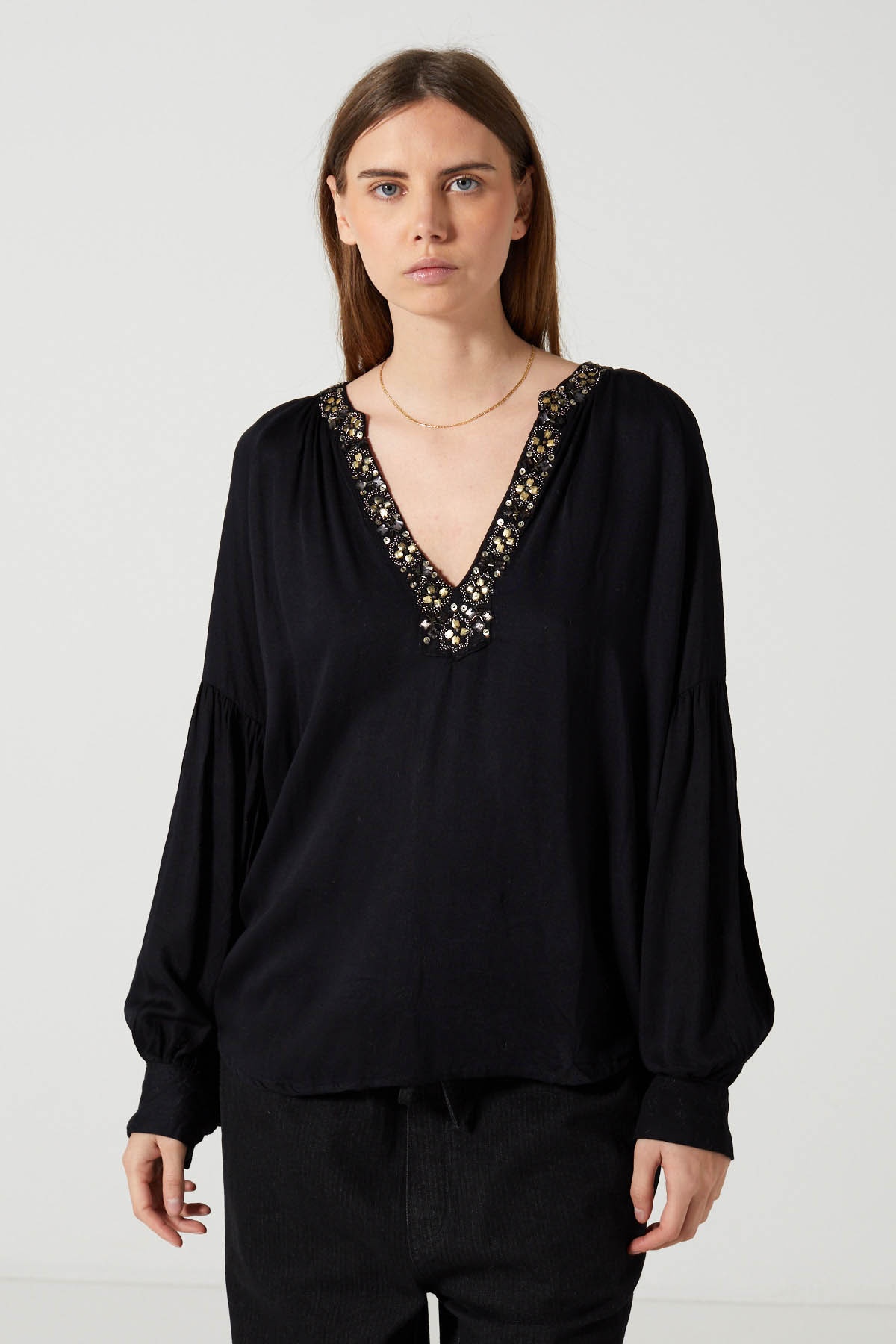 Blouse noire en rayonne . Coupe droite . Encolure en V brodée de perles et sequins . Manches longues tombantes . Poignets boutonnés ....