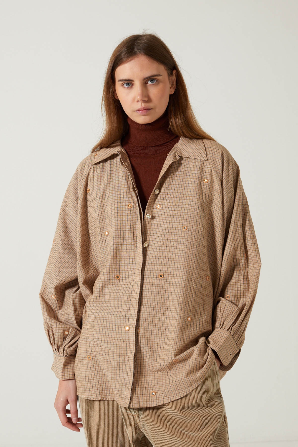 Chemise à carreaux . Col chemise . Coupe oversize . Patte de boutonnage cachée . Manches longues bouffantes . Poignets boutonnés ....