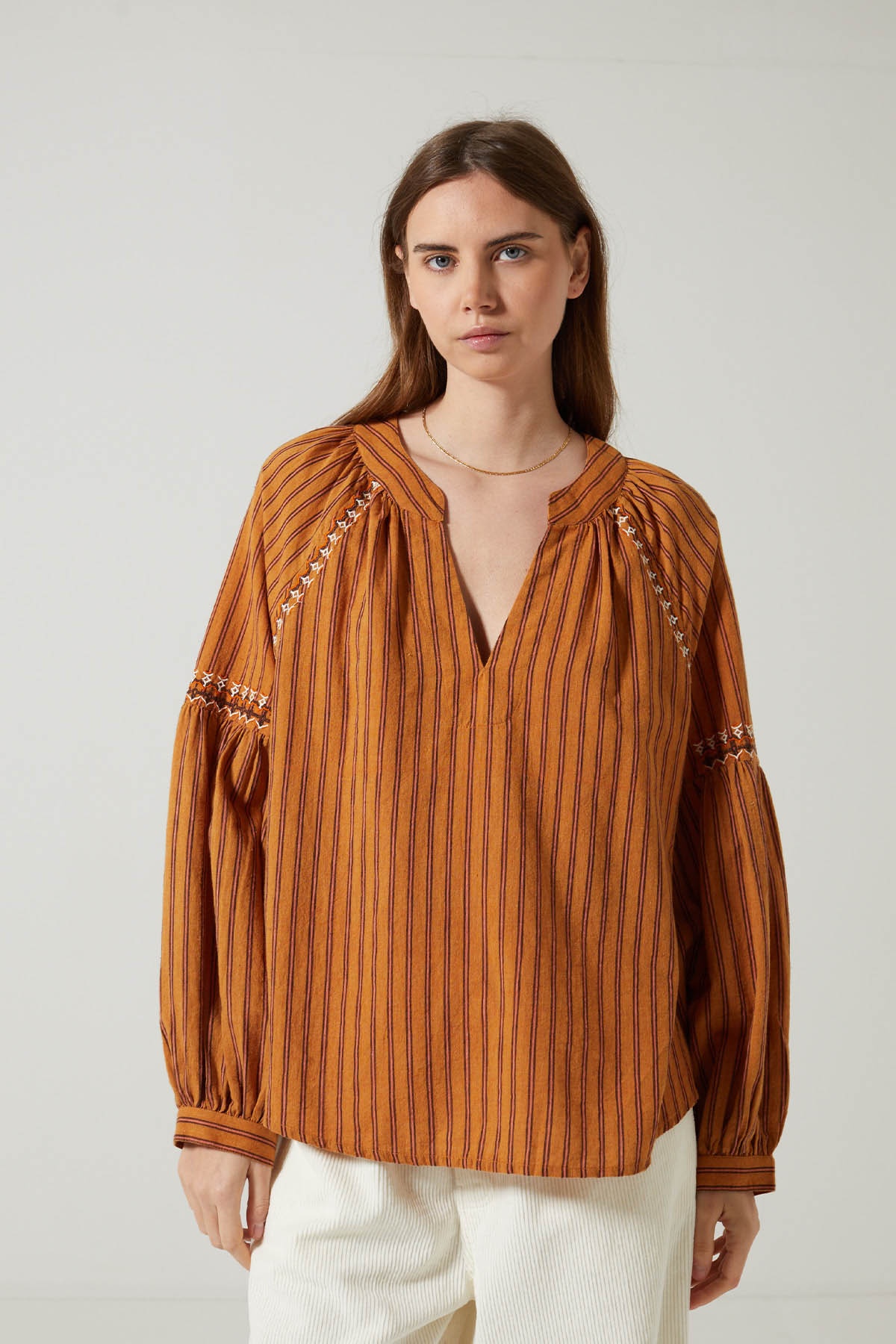 Quick view Chariot Blouse BECKY Prix 185,00 € Blouse à rayures et broderies . Coupe oversize . Encolure en V . Manches longues bouffantes . Broderie manches et emmanchures . Fronce...
