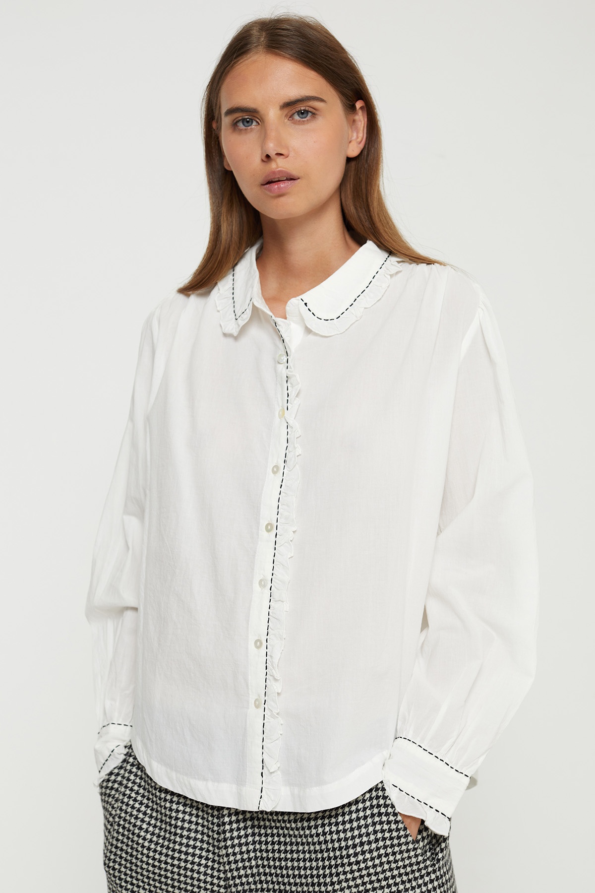 Chemise unie et broderie . Coupe droite . Base légèrement arrondie . Col Claudine et mini volant . Fermeture boutonné avec un petit volant...