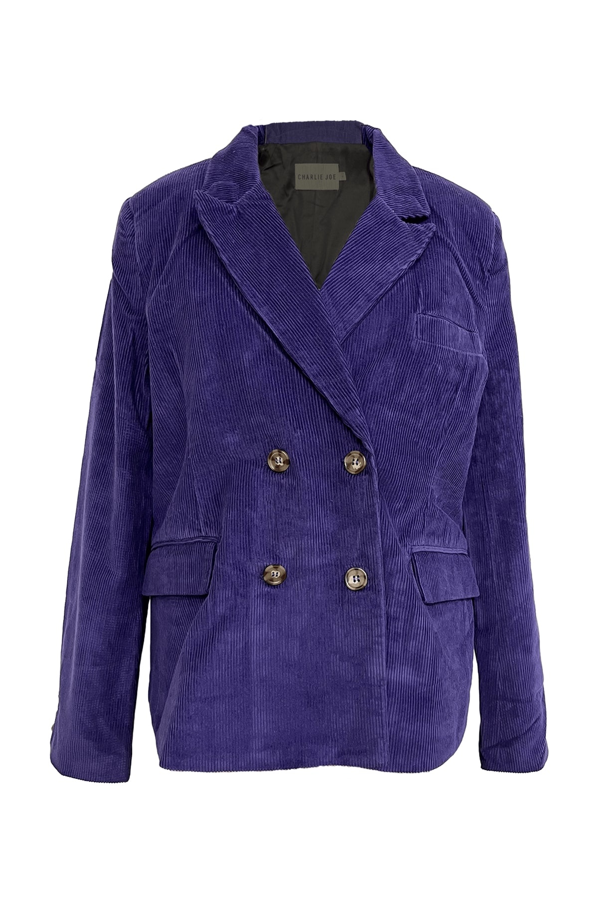Blazer costume en velours côtelé . Coupe droite . Manches longues . Col tailleur . Fermeture boutonnée croisée . Poche passepoil à la...