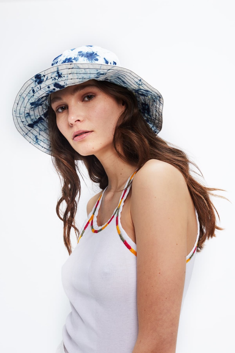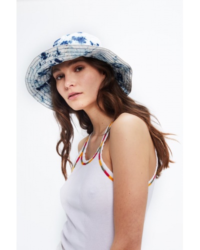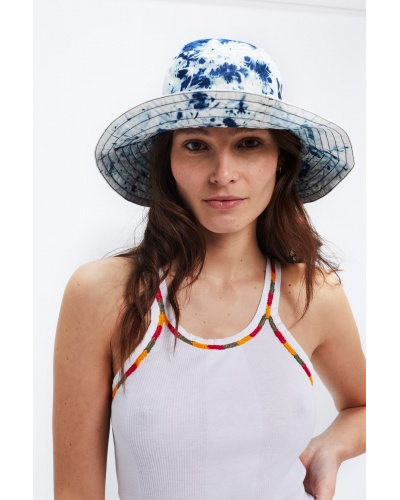 Le bob Doume est habillé d'un tie&dye bleu marine. Il est réalisé en jean décoloré et présente un bord rehaussé de surpiqûres contrastantes. Associez le, avec un tee-shirt blanc et un short en denim.