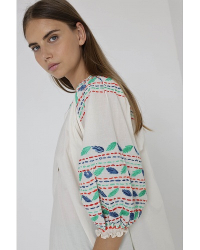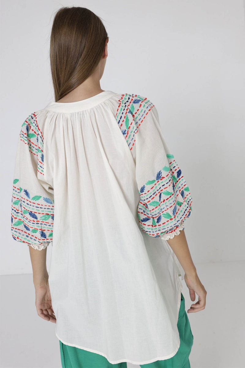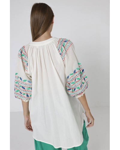 Des broderies délicates ornent les manches et les épaules, apportant une touche artistique, féminine et artisanale à cette pièce. Ces détails artistiques ajoutent une touche d'audace à cette pièce classique en blanc, lui conférant un style unique et moderne.