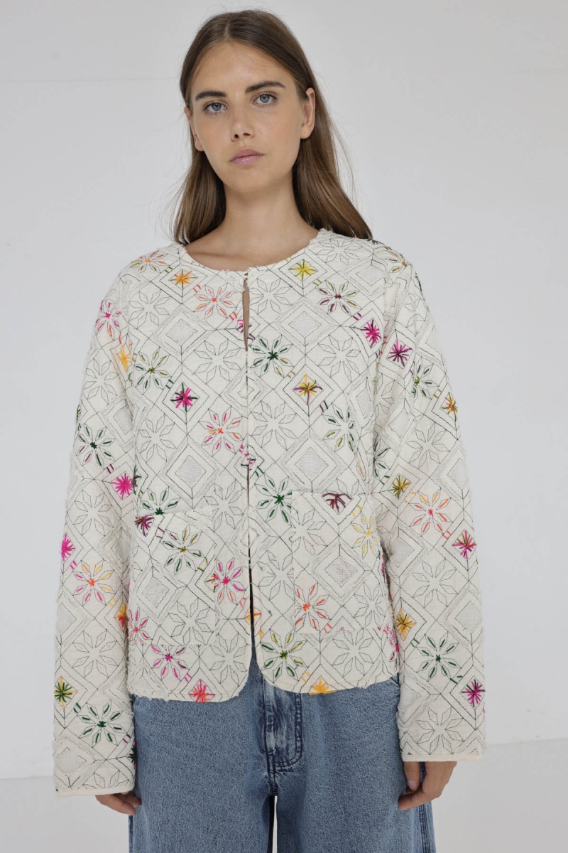 Ses motifs floraux sont accentués par des broderies colorées, apportant une touche artisanale à cette pièce unique. Laissez vous séduire par le confort et l'originalité moderne de la veste Cameron.