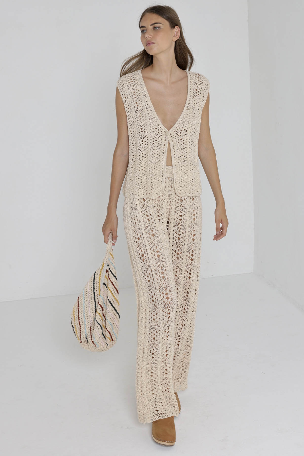 Sa teinte beige naturelle s'harmonise parfaitement avec le pantalon ou le short assorti en crochet pour un ensemble élégant et coordonné. Vous pouvez également l'associer à un pantalon en toile ou un jean pour un look décontracté et tendance.