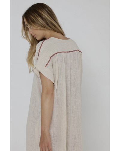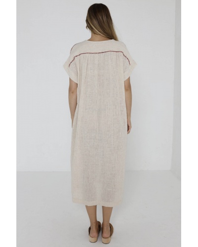 Les épaules et le dos sont agrémentés de lignes brodées, donnant à cette robe un côté artisanal unique. Sa couleur beige ajoute une élégance naturelle à votre look, offrant un équilibre parfait entre simplicité et sophistication.