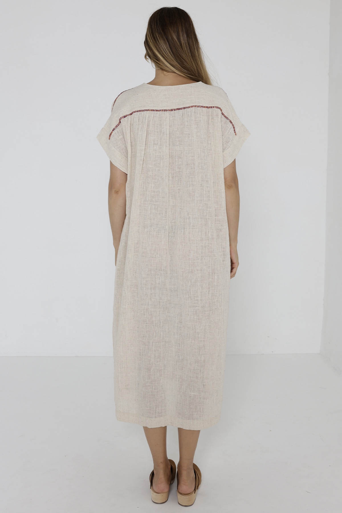 Les épaules et le dos sont agrémentés de lignes brodées, donnant à cette robe un côté artisanal unique. Sa couleur beige ajoute une élégance naturelle à votre look, offrant un équilibre parfait entre simplicité et sophistication.
