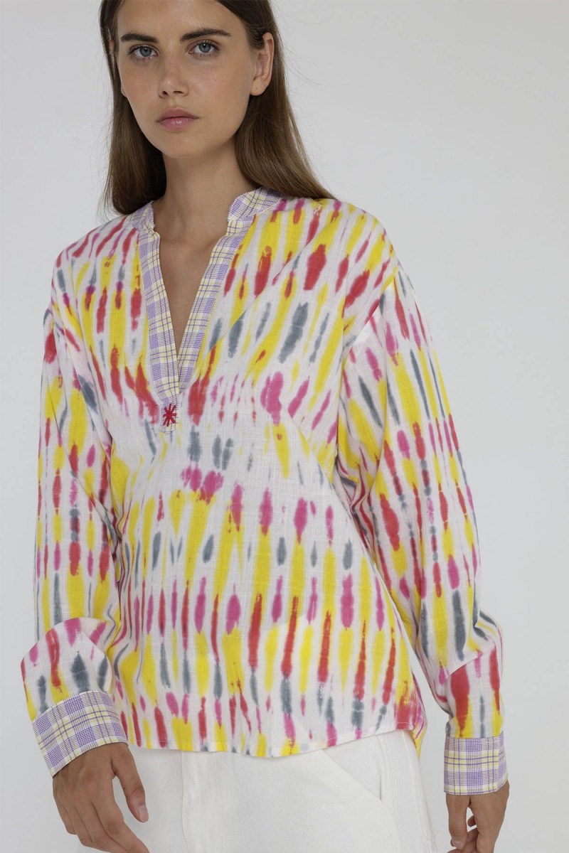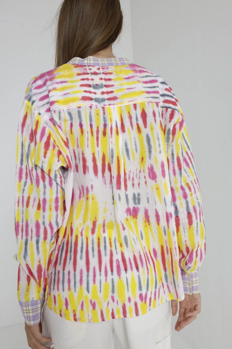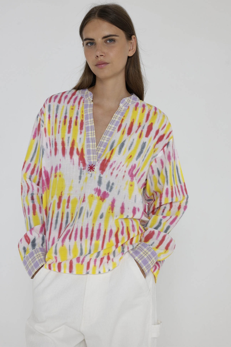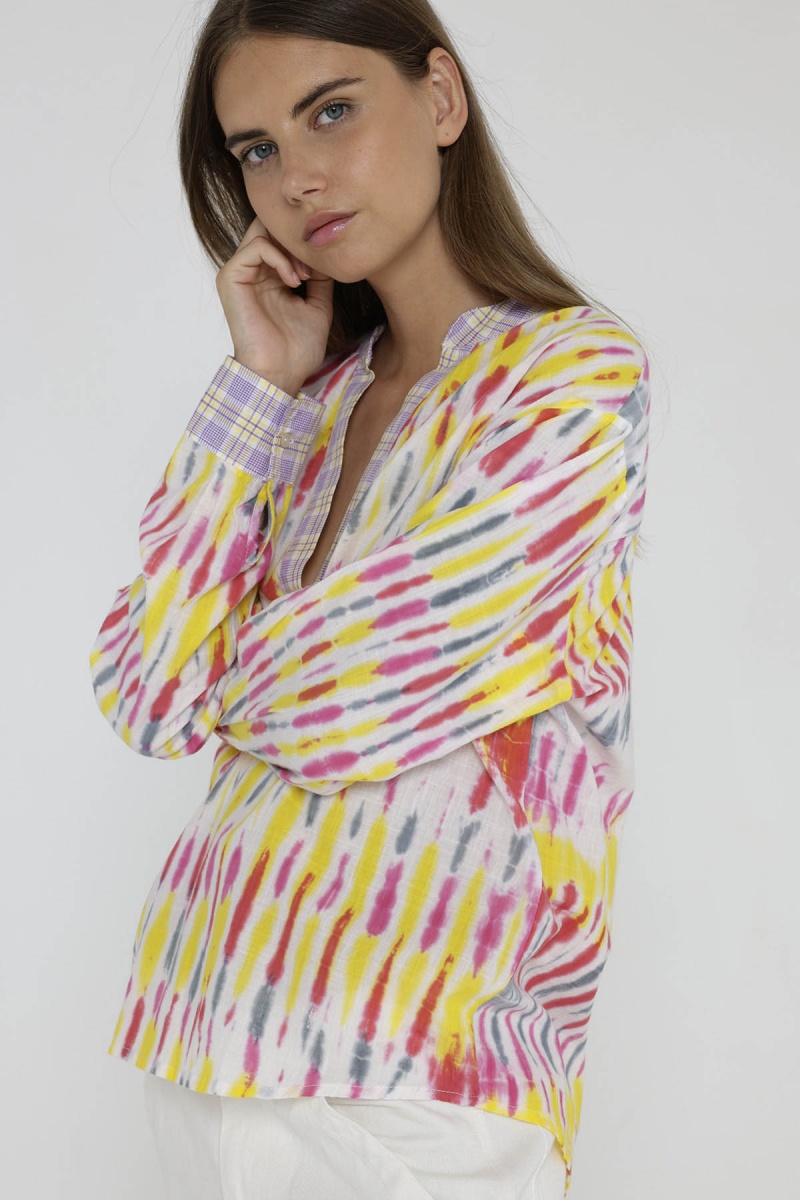 Laissez vous séduire par la blouse Lizbo et son mariage hamonieux de motifs. Les empiècements poignets et l'encolure adoptent une esthétique carreaux, tandis que le reste du vêtement se pare d'un motif en art dye.