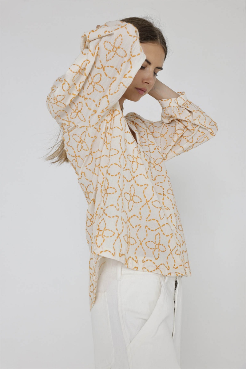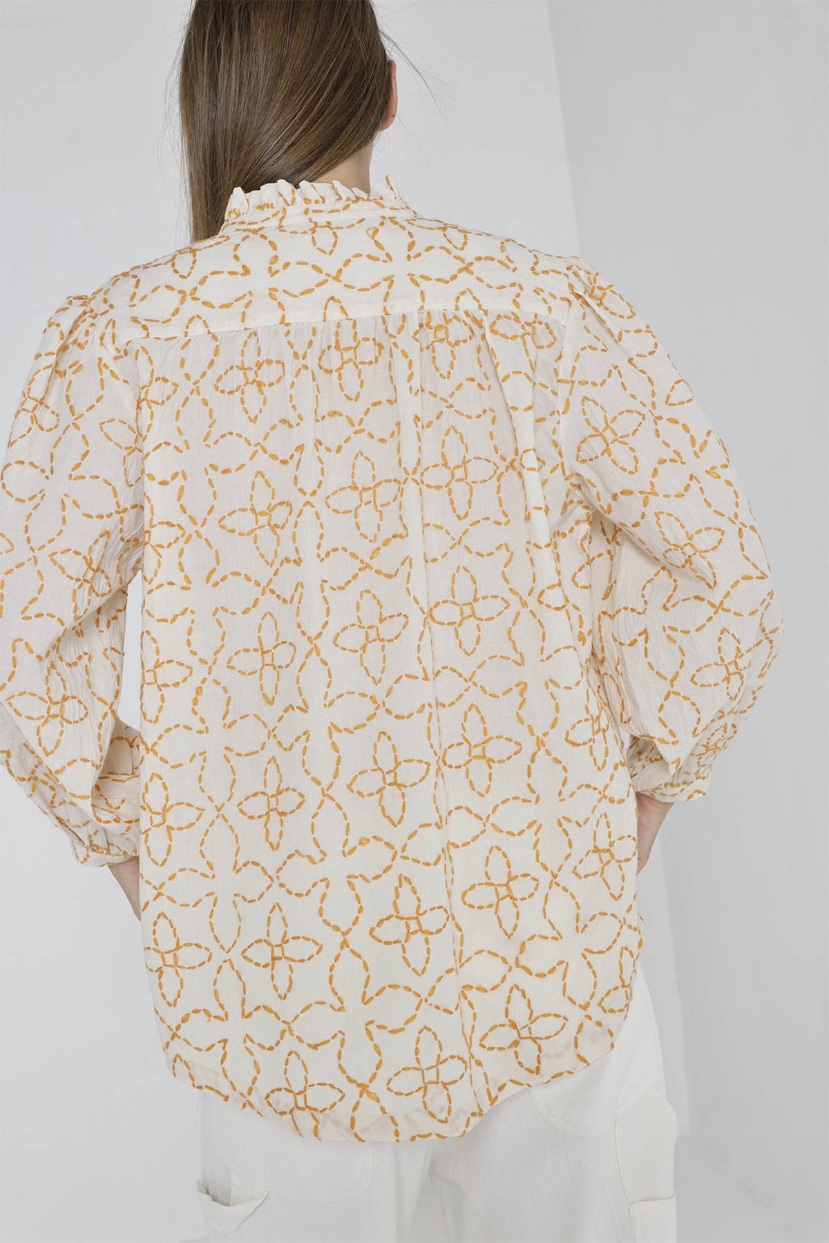 La chemise Madison incarne le romantisme avec son motif floral brodé et son col à volant.