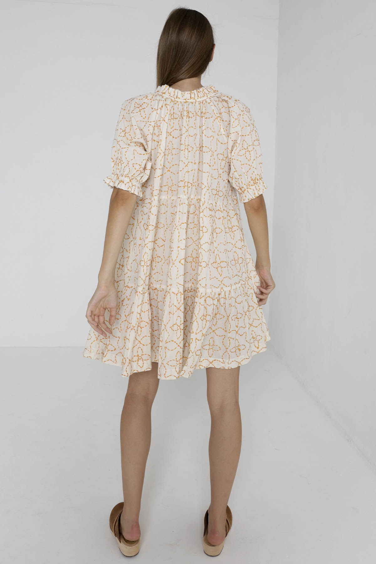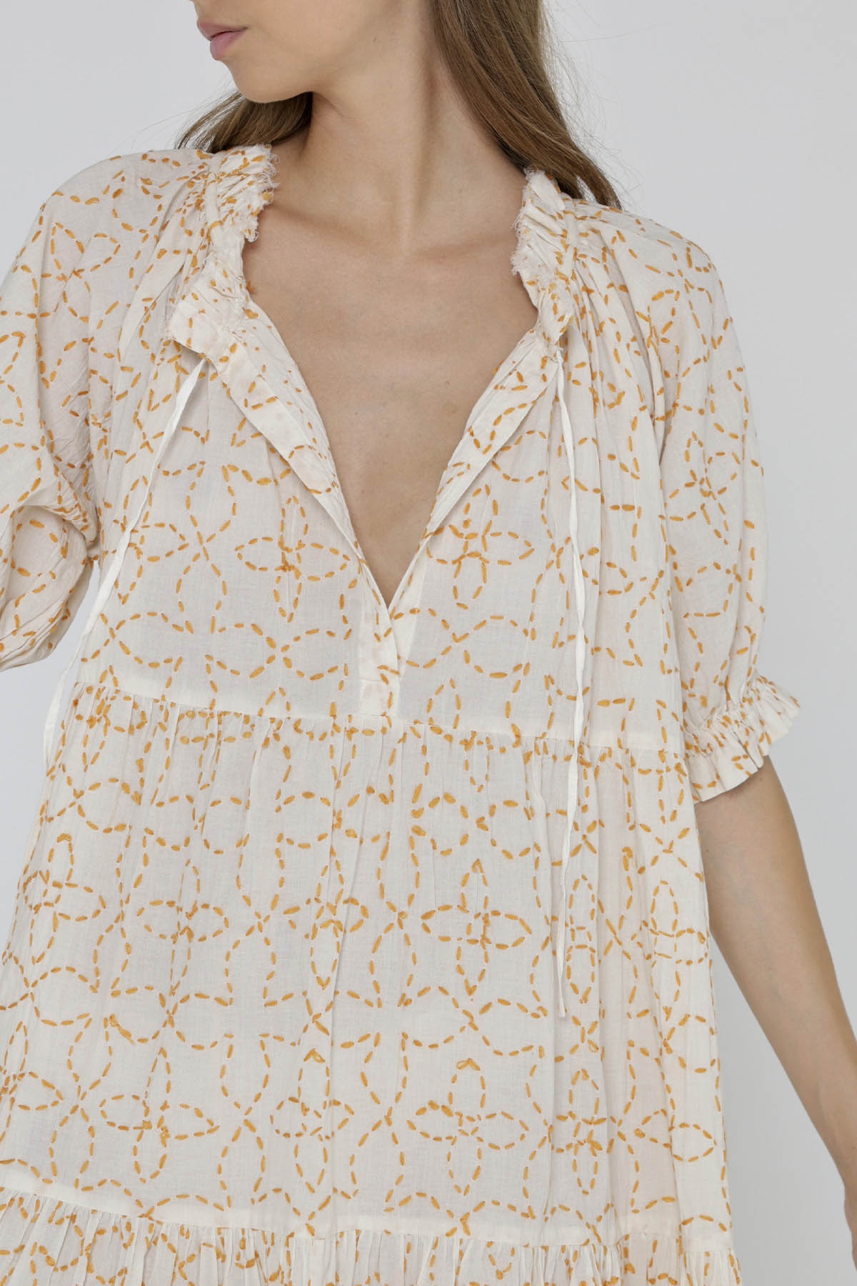 Ses manches courtes bouffantes et son col montant à volant apportent une touche de grâce à cette robe courte et ample, parfaite pour les jours ensoleillés et les soirées élégantes.