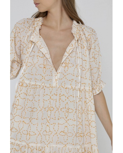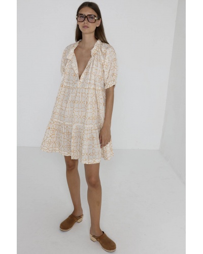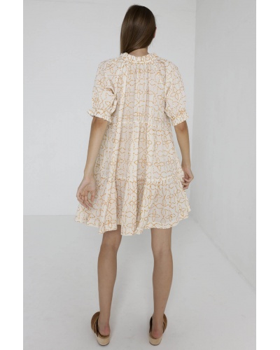 Ses manches courtes bouffantes et son col montant à volant apportent une touche de grâce à cette robe courte et ample, parfaite pour les jours ensoleillés et les soirées élégantes.