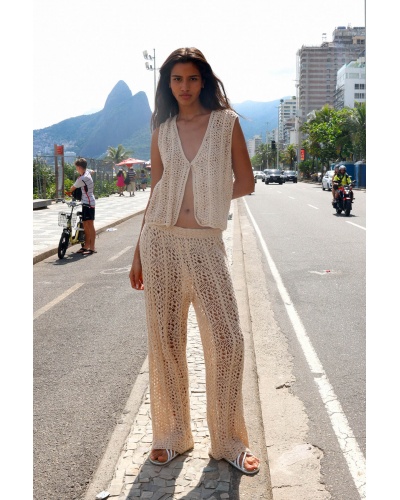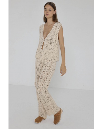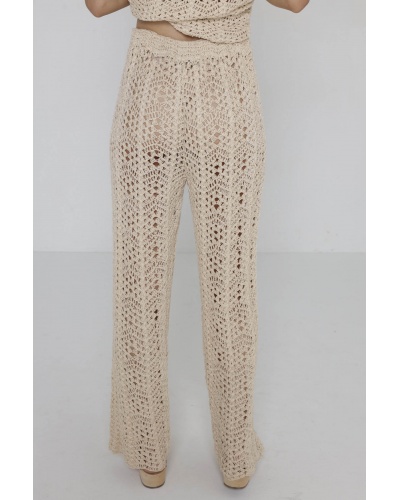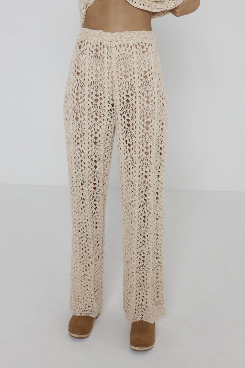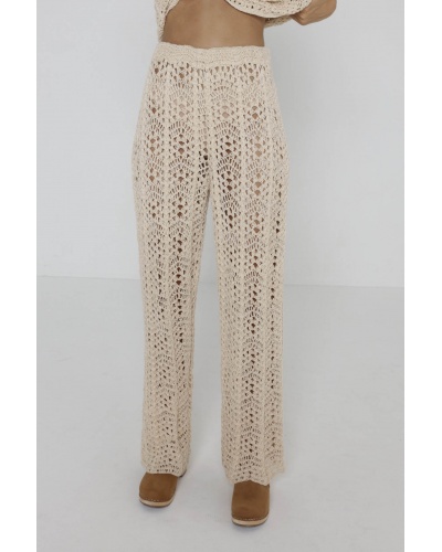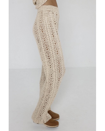 Le pantalon Soley incarne l'esprit bohème avec sa conception en crochet beige aéré et ses détails ajourés.