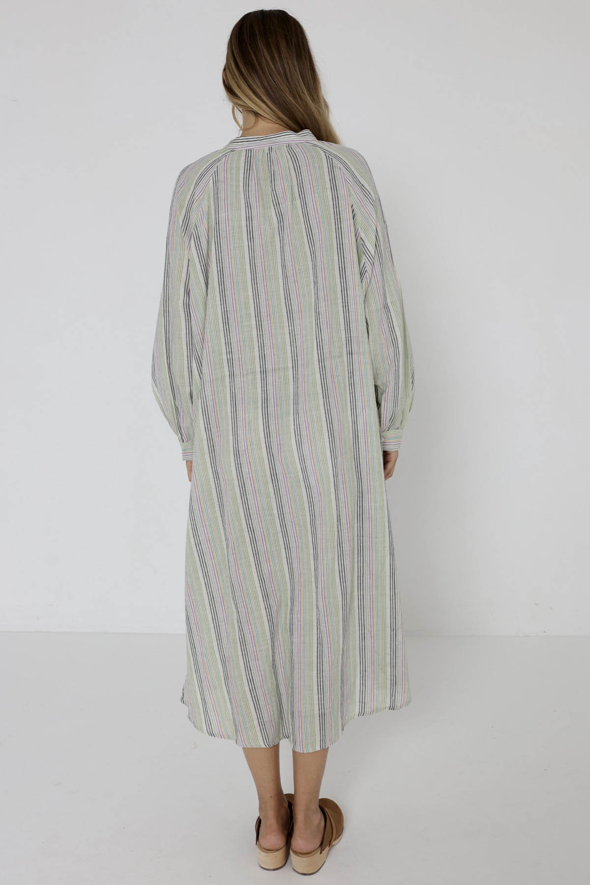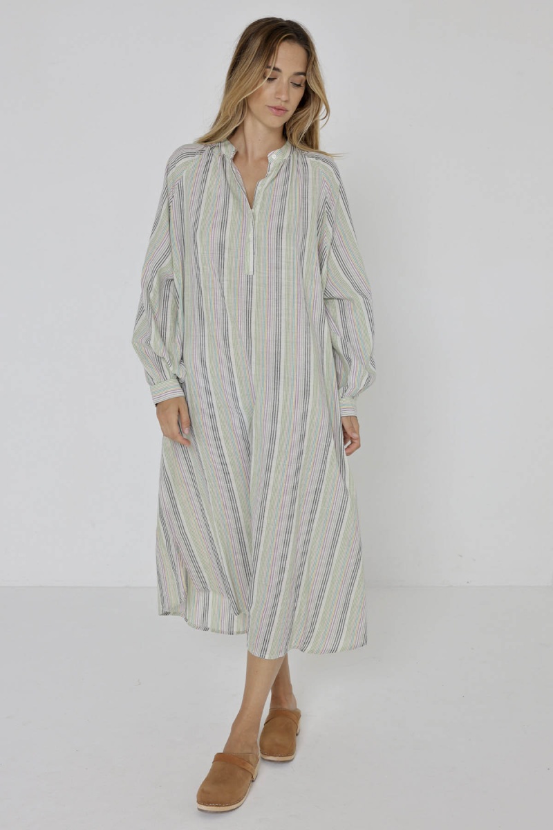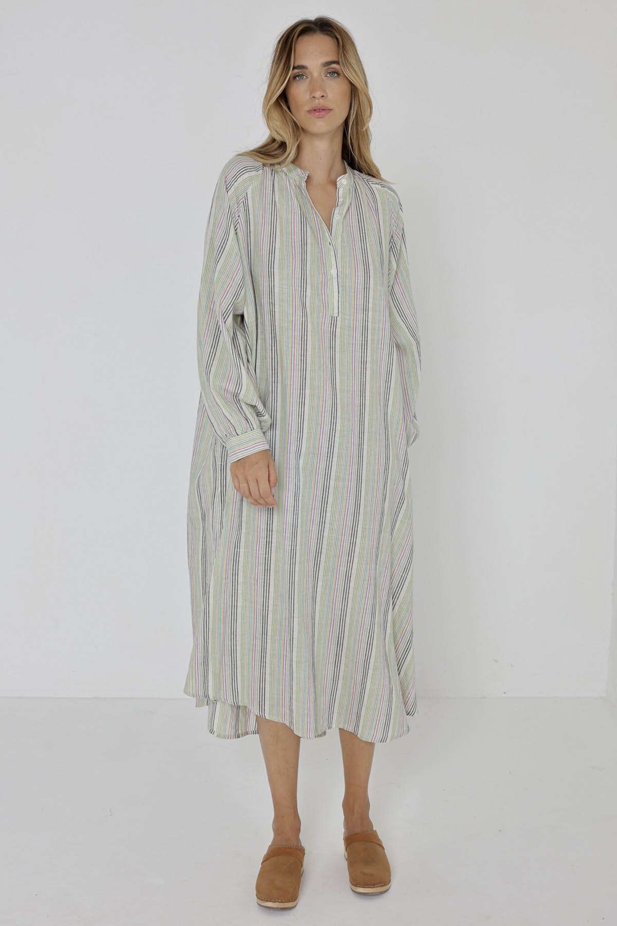 La robe Tess est une pièce incontournable pour la saison estivale. Avec ses rayures élégantes et ses manches longues, elle allie style et confort avec brio.