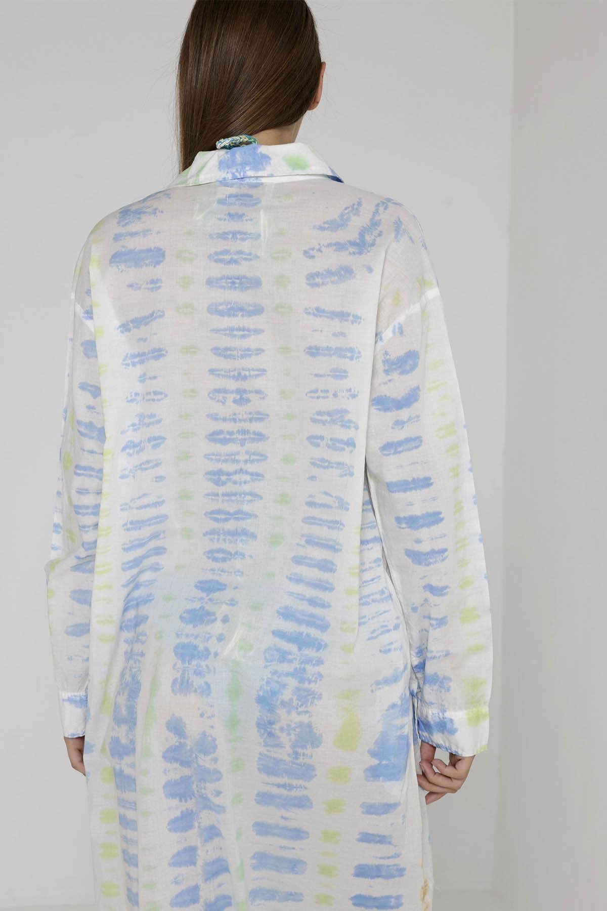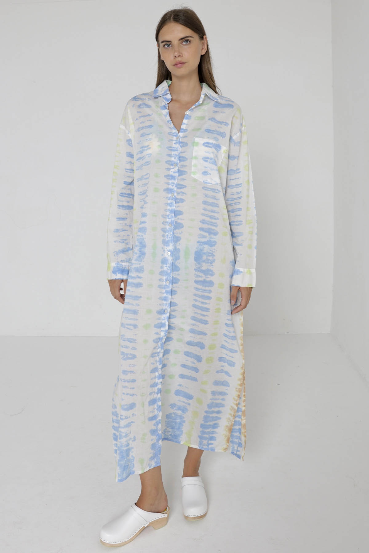 La robe chemise longue Windmil est une ode à la légèreté estivale. Confectionnée dans un coton fin et léger, elle arbore un motif art dye qui lui confère un charme unique et coloré.