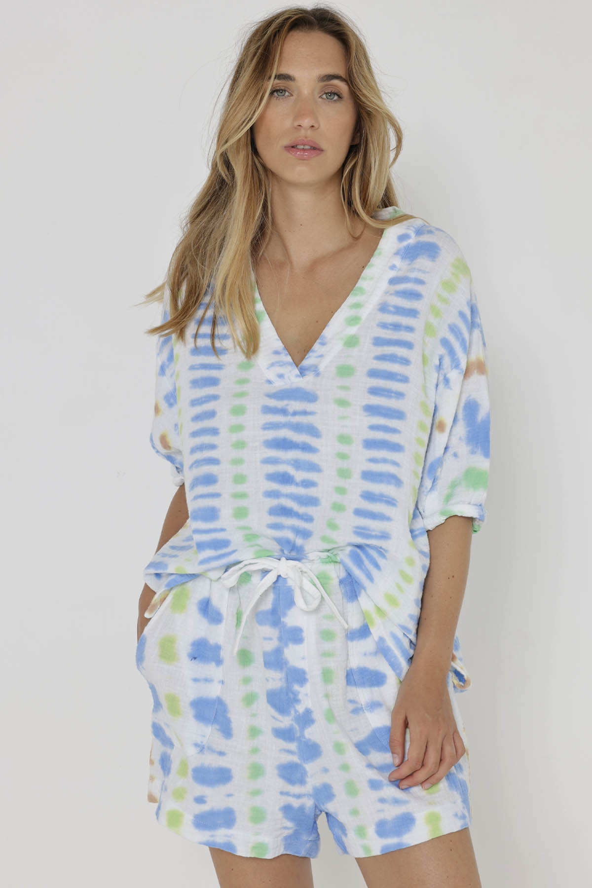 Plongez dans la saison estivale avec le short Jojie et son art dye coloré. Confectionné en coton léger, ce short offre un confort absolu pour la période à venir.