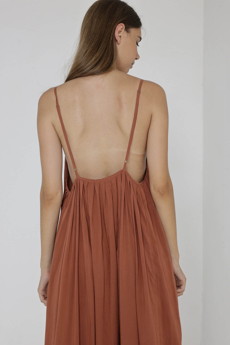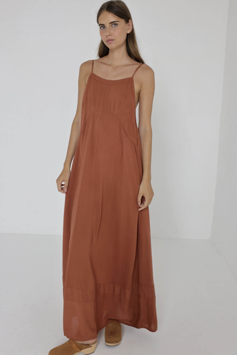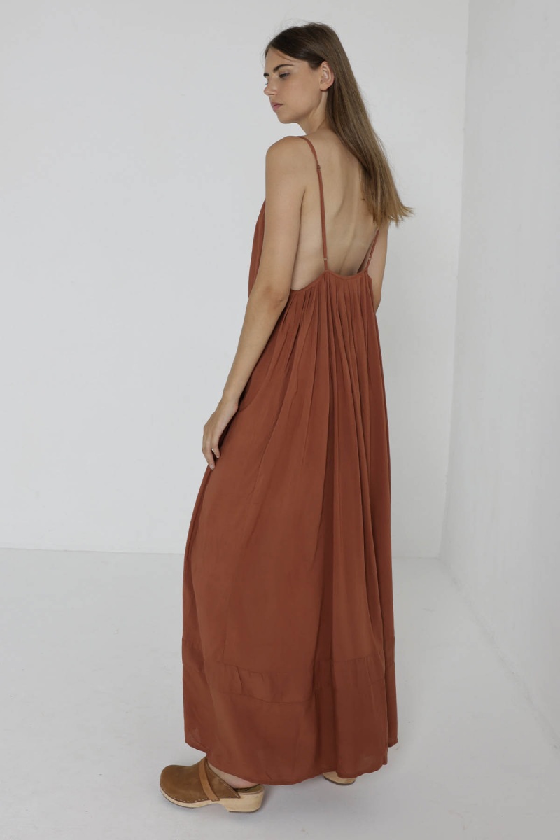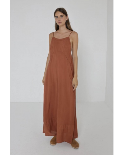 Plongez dans l'été avec notre robe Sutan en couleur rust. Fabriquée en rayonne légère, cette robe longue offre une coupe ample pour un confort optimal par temps chaud.