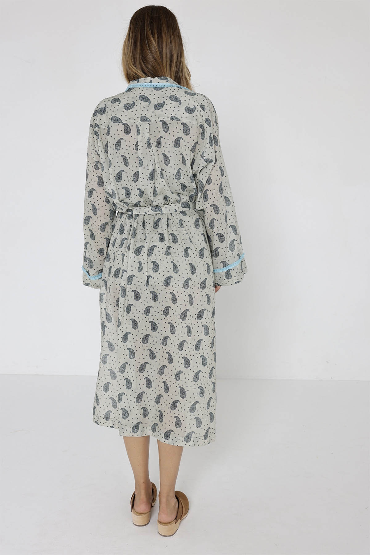 Découvrez le kimono Letty en coton léger, orné d'un motif cachemire aux tons de gris et bleu. Avec sa coupe évasée et ses larges revers de poignet, ce kimono offre une élégance décontractée.
